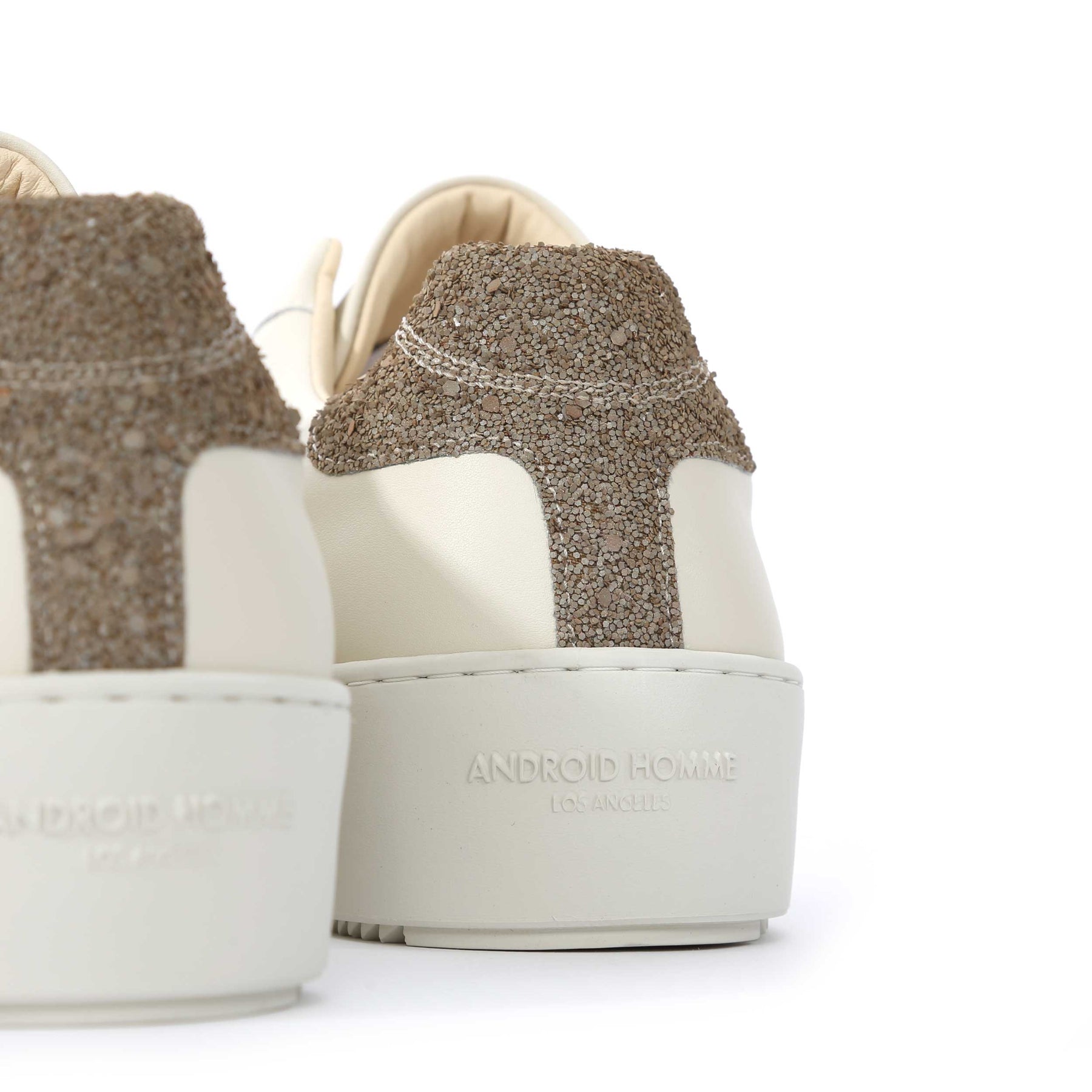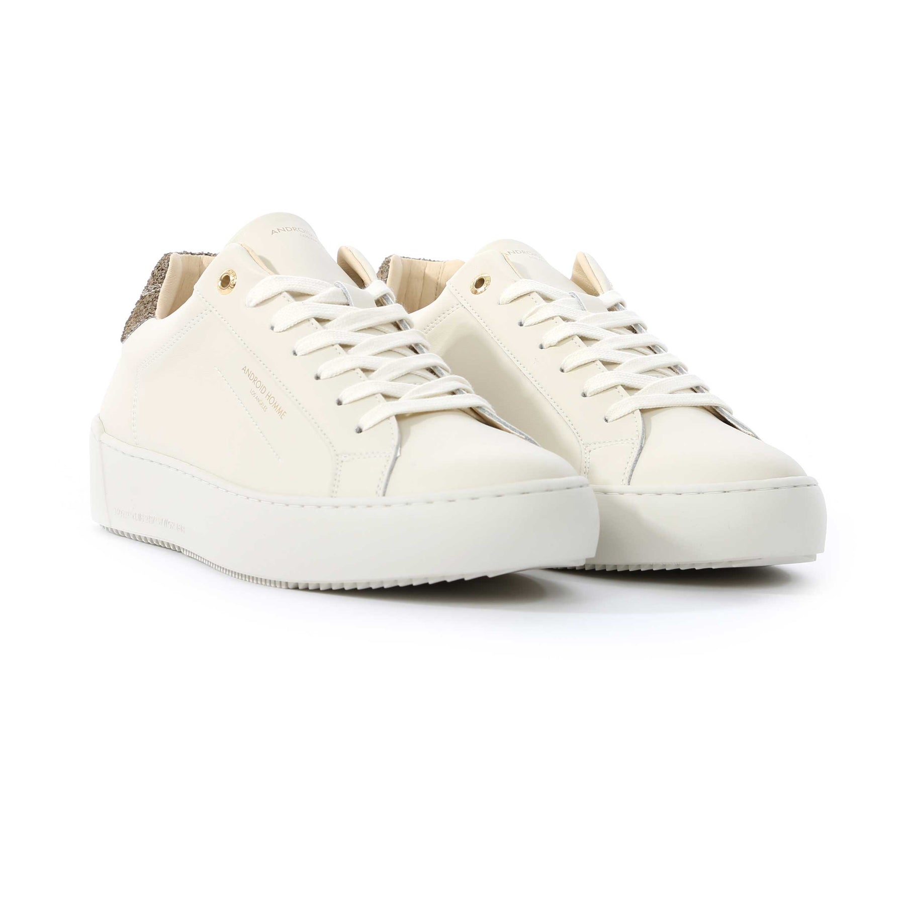 The Android Homme Zuma trainers are designed with a premium leather upper, offering a smooth and sleek appearance. The standout feature is the unique textured glitter reflective heel panel which gives this trainer its unique flair.