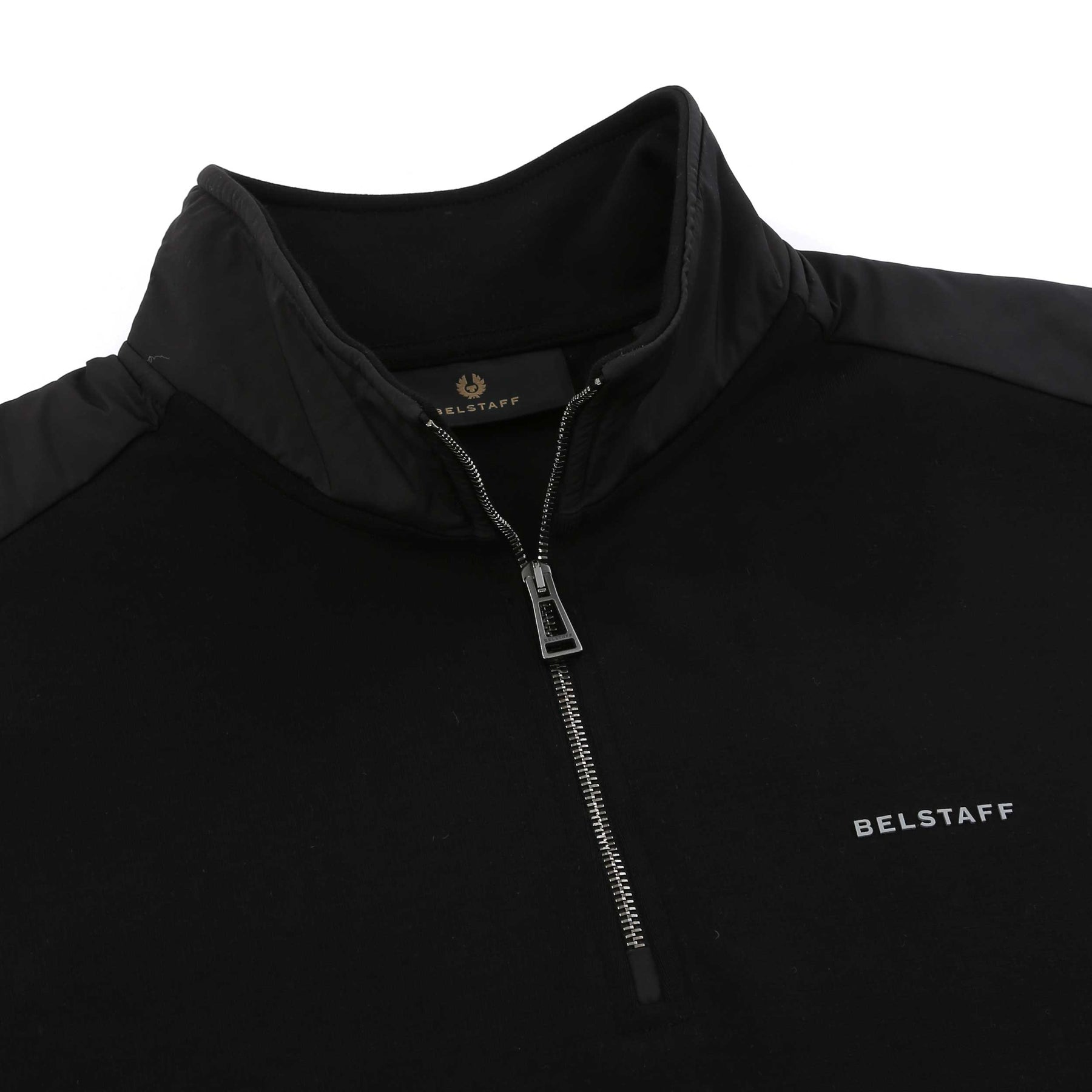 Belstaff Alloy Quarter Zip Sweat Top in Black. A quarter zip sweat top featuring a funnel neck collar which can be worn flat or zipped up. Technical shell panel detailing to the shoulders and neck. Ribbed cuffs and waistband. Finished with a silicone Belstaff logo to the chest. Team up with sweat pants or jeans.