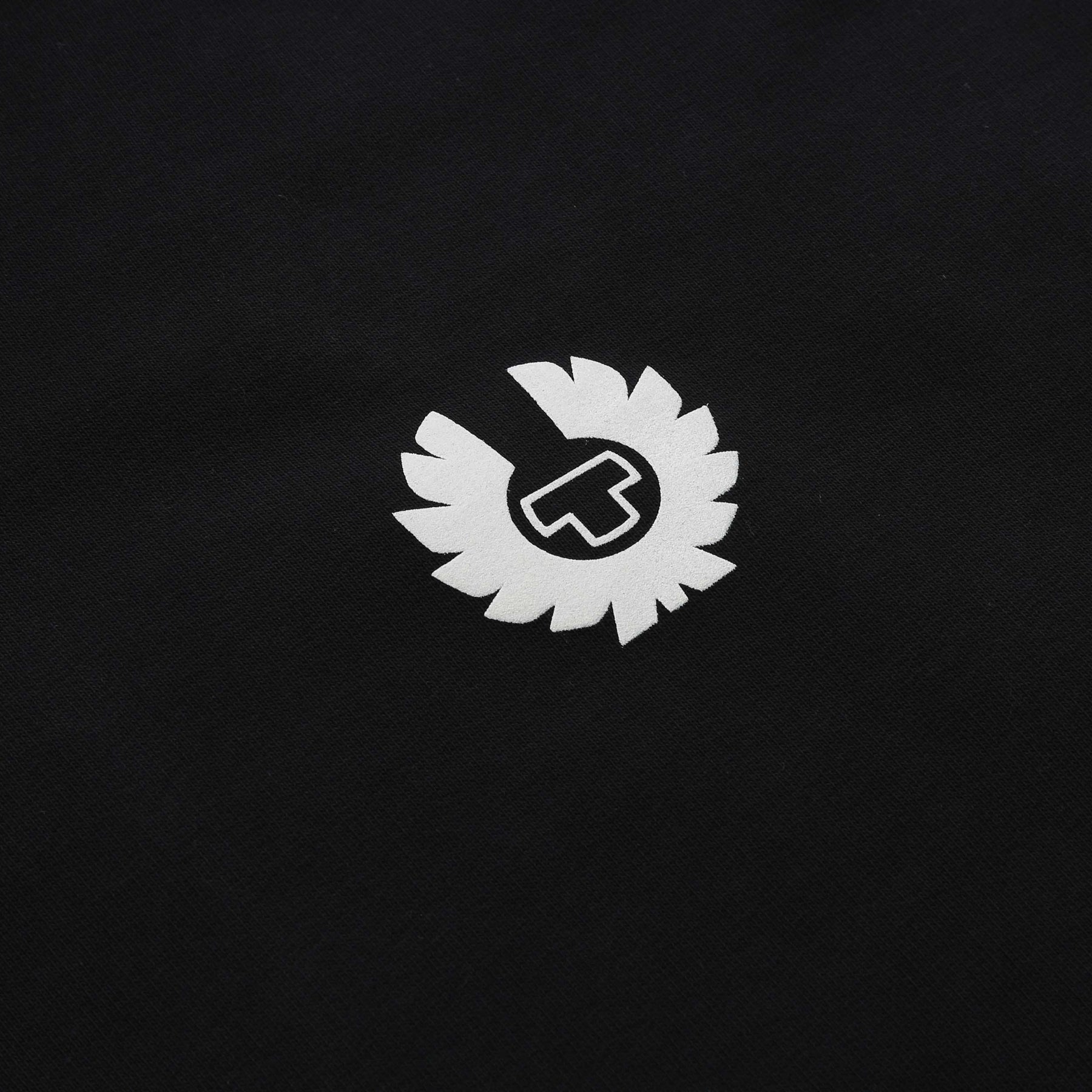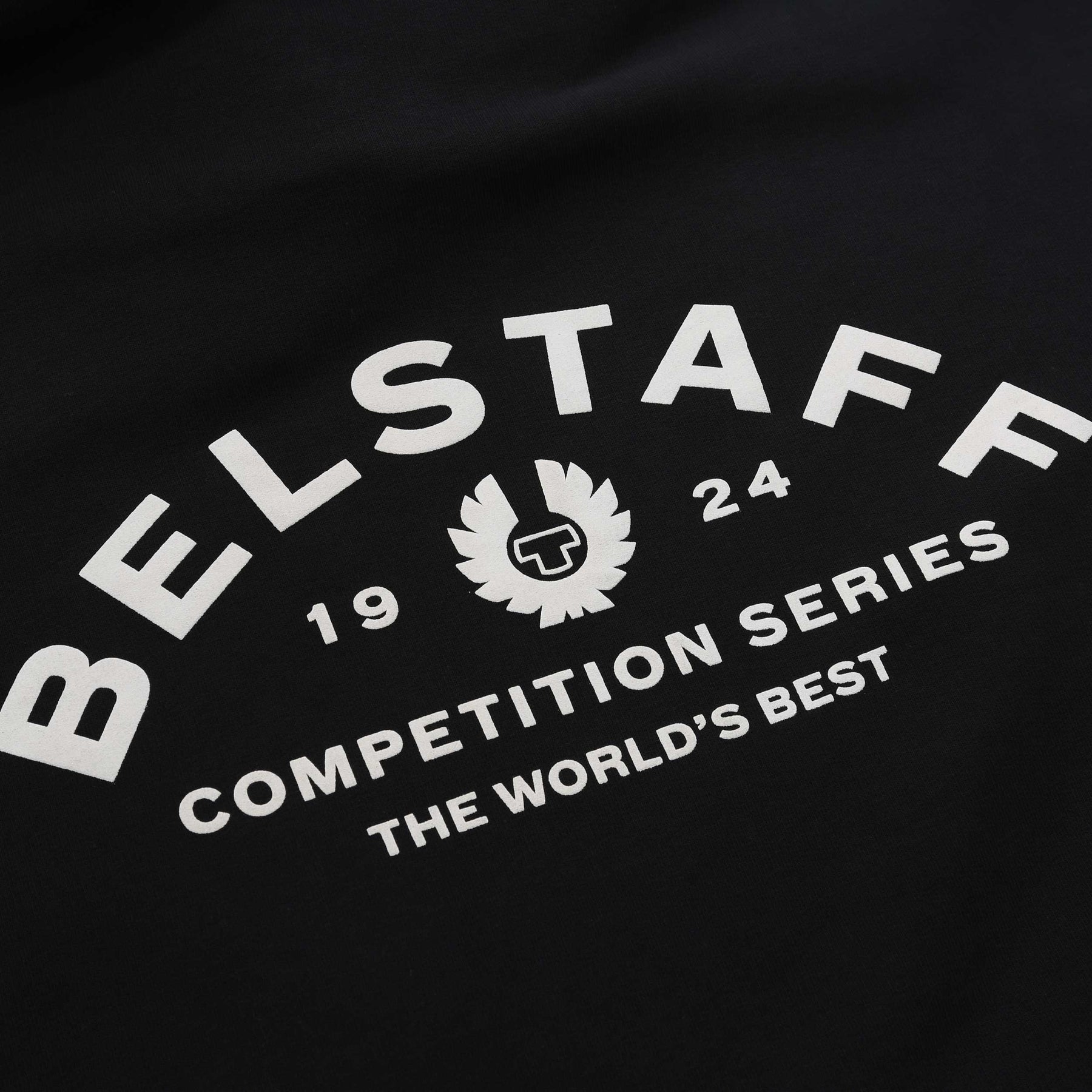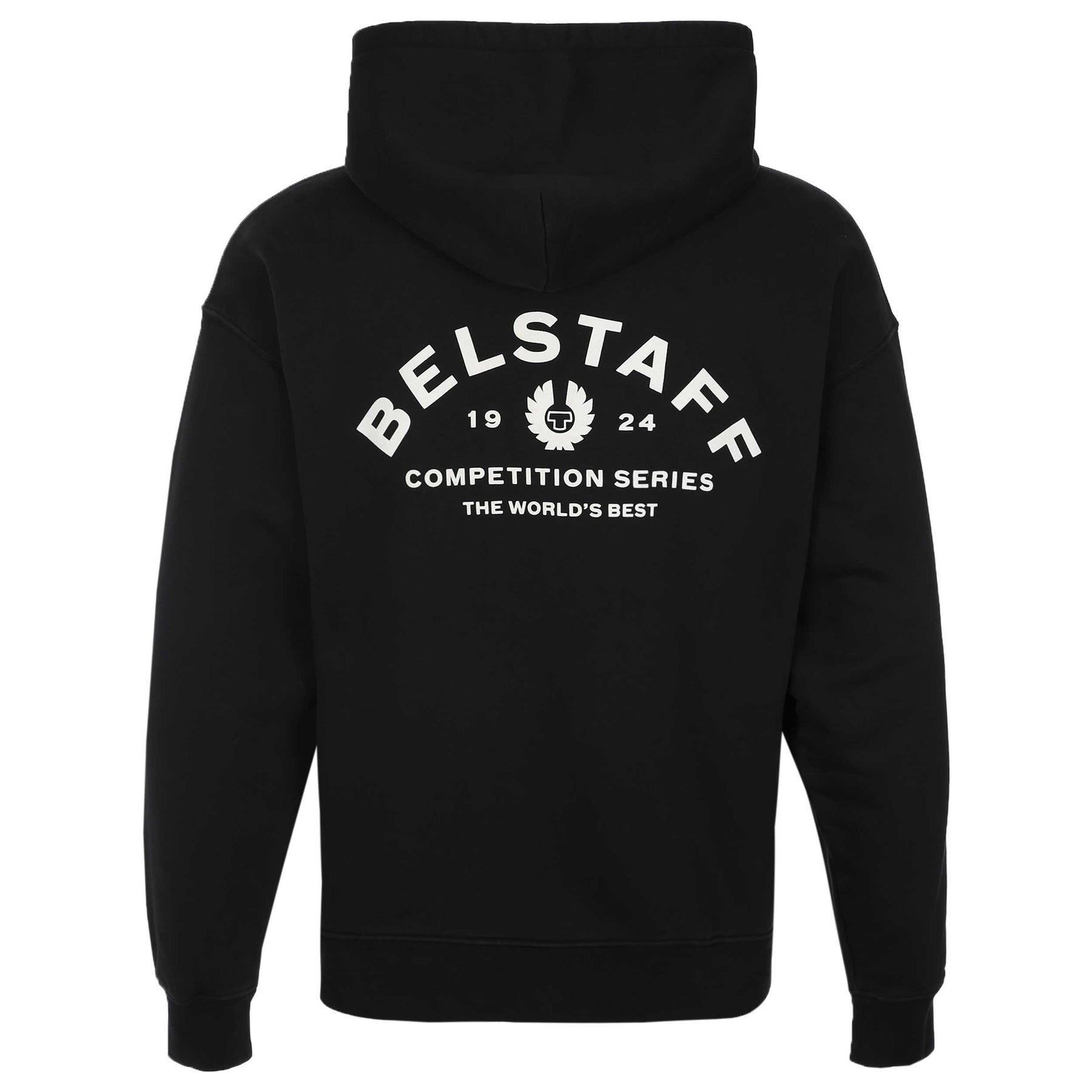 Belstaff Competition Hoodie Sweat Top in Black. The Competition Series celebrates Belstaff’s motorsport heritage, featuring the original 1990s Belstaff logo inspired by customised archival competition race suits. The Competition Hoodie Sweat Top is crafted from heavyweight garment-dyed cotton fleece, delivering exceptional warmth, durability and a premium feel.