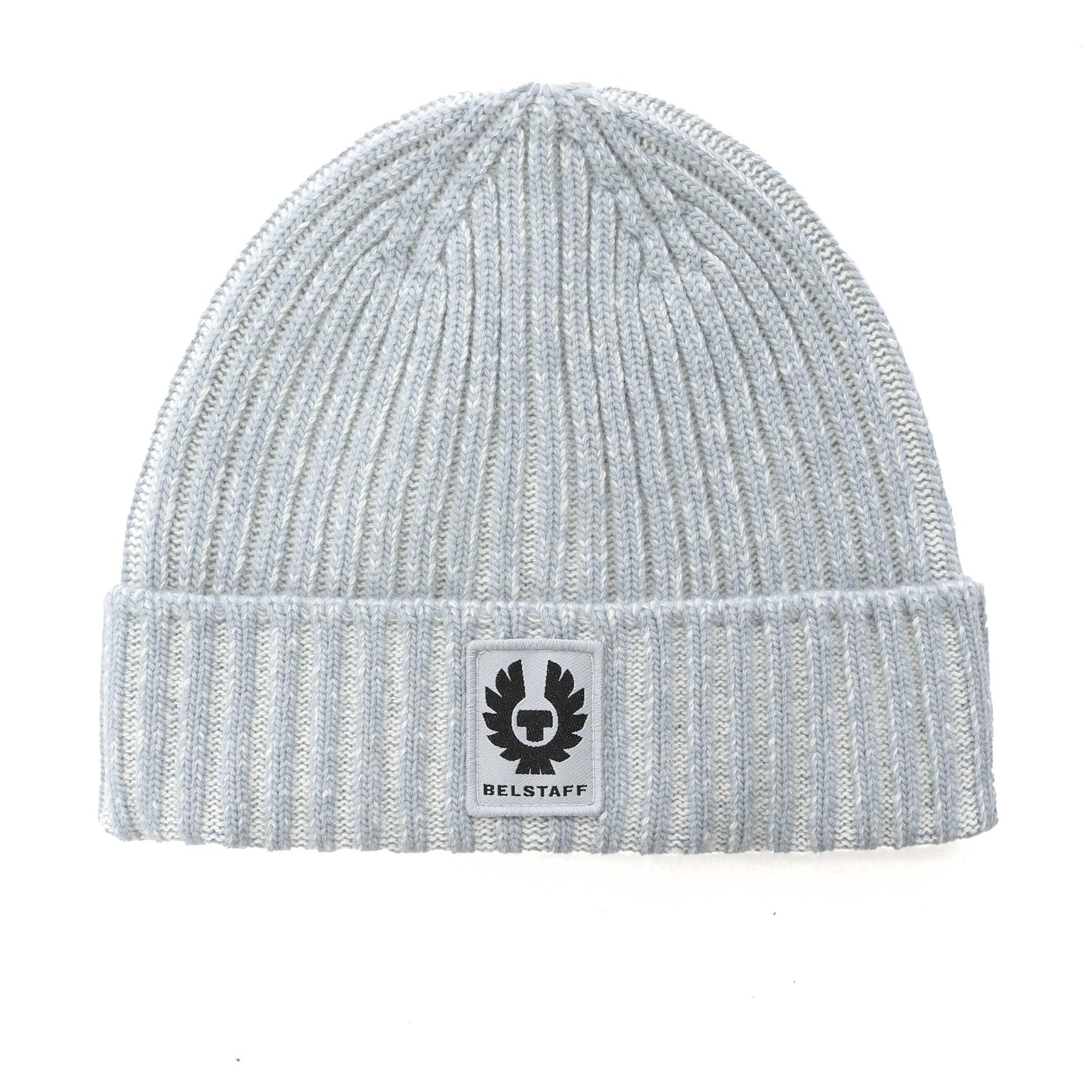 Belstaff Plated Watch Beanie Hat in Quarry Blue & Silver Birch. A classic beanie style hat by Belstaff. This hat is made using soft lambswool which will keep your head warm this Winter. With a ribbed design and Belstaff logo badge on the front of the hat.