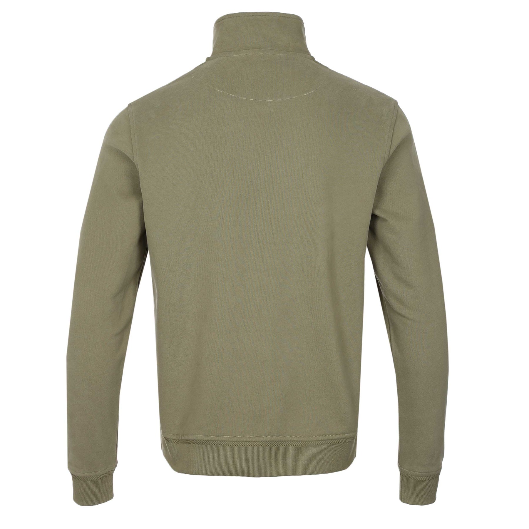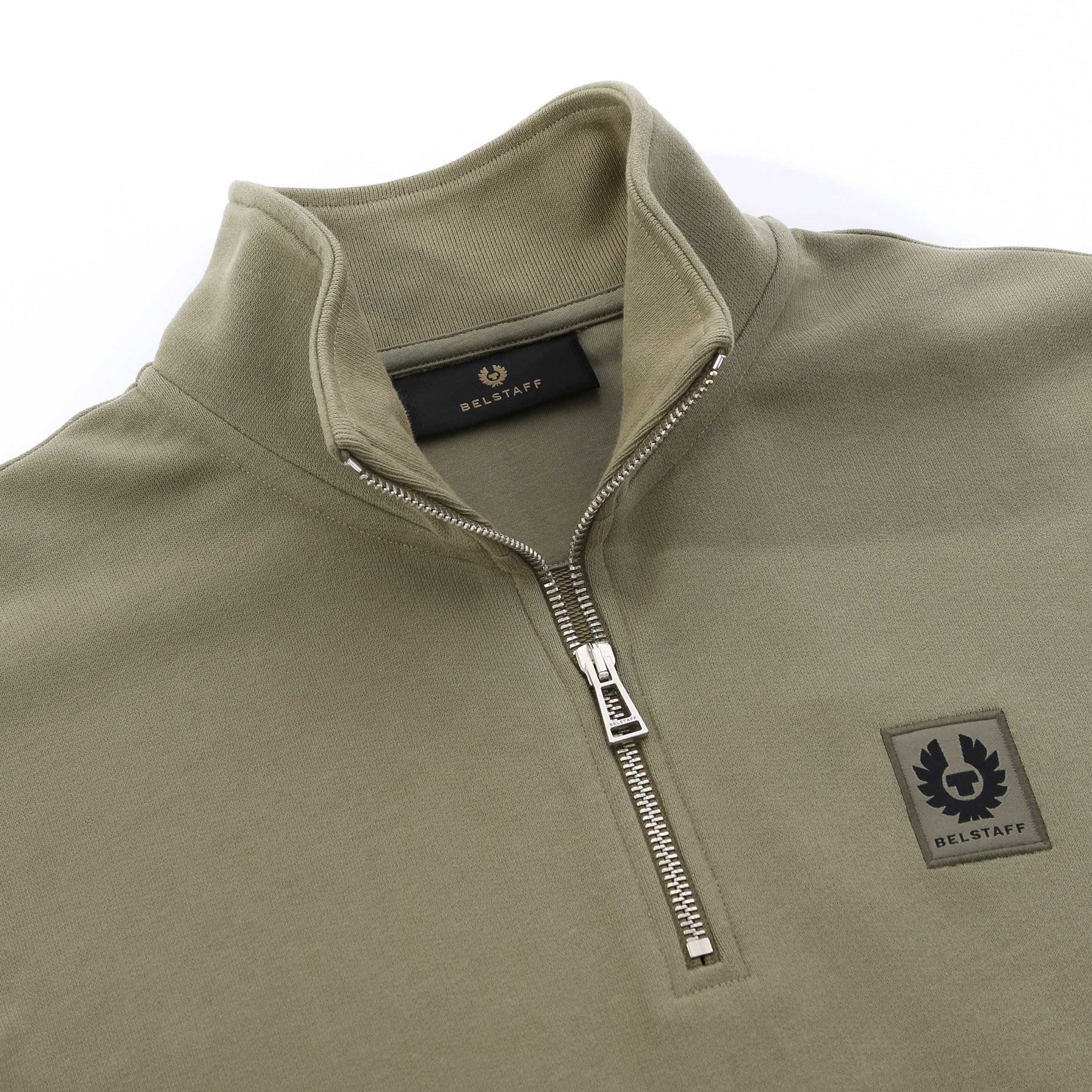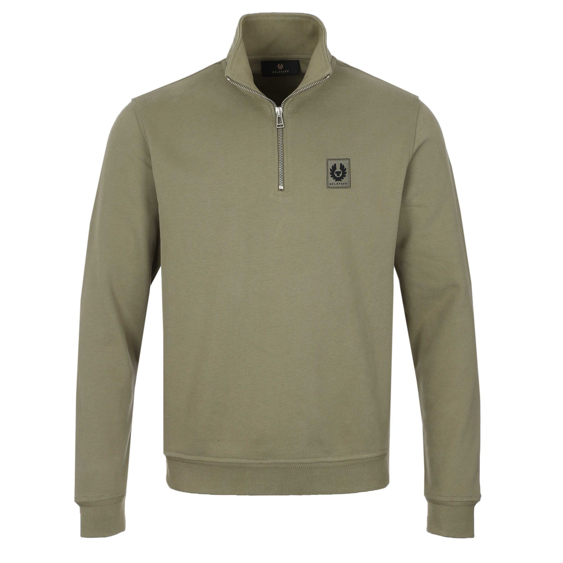 Belstaff Quarter Zip Sweat Top in Fatigue Green. A quarter zip sweat top featuring a funnel neck collar which can be worn flat or zipped up. Ribbed cuffs and waistband. Finished with the signature Belstaff logo badge on the chest. Team up with sweat pants or jeans.