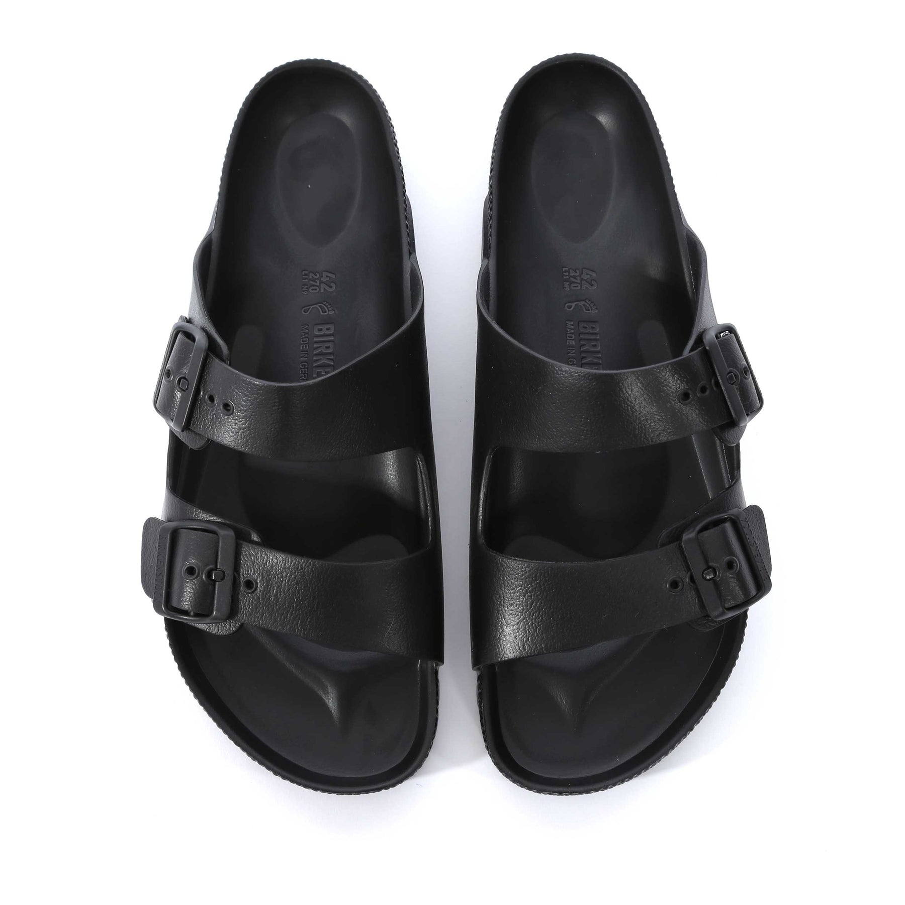 Birkenstock Arizona EVA Sandal in Black. The Birkenstock Arizona EVA reimagines the brand’s iconic two-strap sandal in an ultra-lightweight, modern material designed for everyday versatility. Based on the classic cork sandal silhouette, this version is crafted entirely from high-quality EVA, delivering the signature Birkenstock comfort in a flexible, water-friendly design. Engineered to be waterproof, ultra-lightweight and highly flexible, the EVA construction makes these sandals perfect for holidays, poolside wear, the beach or relaxed everyday use. The material is odour-neutral, skin-friendly and tested for harmful substances, ensuring comfort and peace of mind with every step.