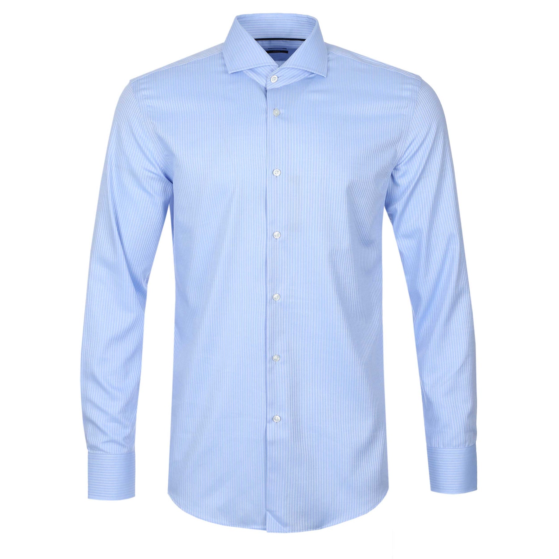 BOSS H Hank spr B1 C1 253 Shirt in Light Pastel Blue. A long sleeve BOSS shirt in a slim fit. Featuring a full button fastening and a contrasting stripe design throughout. Crafted from a soft performance stretch material, designed for movement and breathability. Treated with an easy-iron finish.