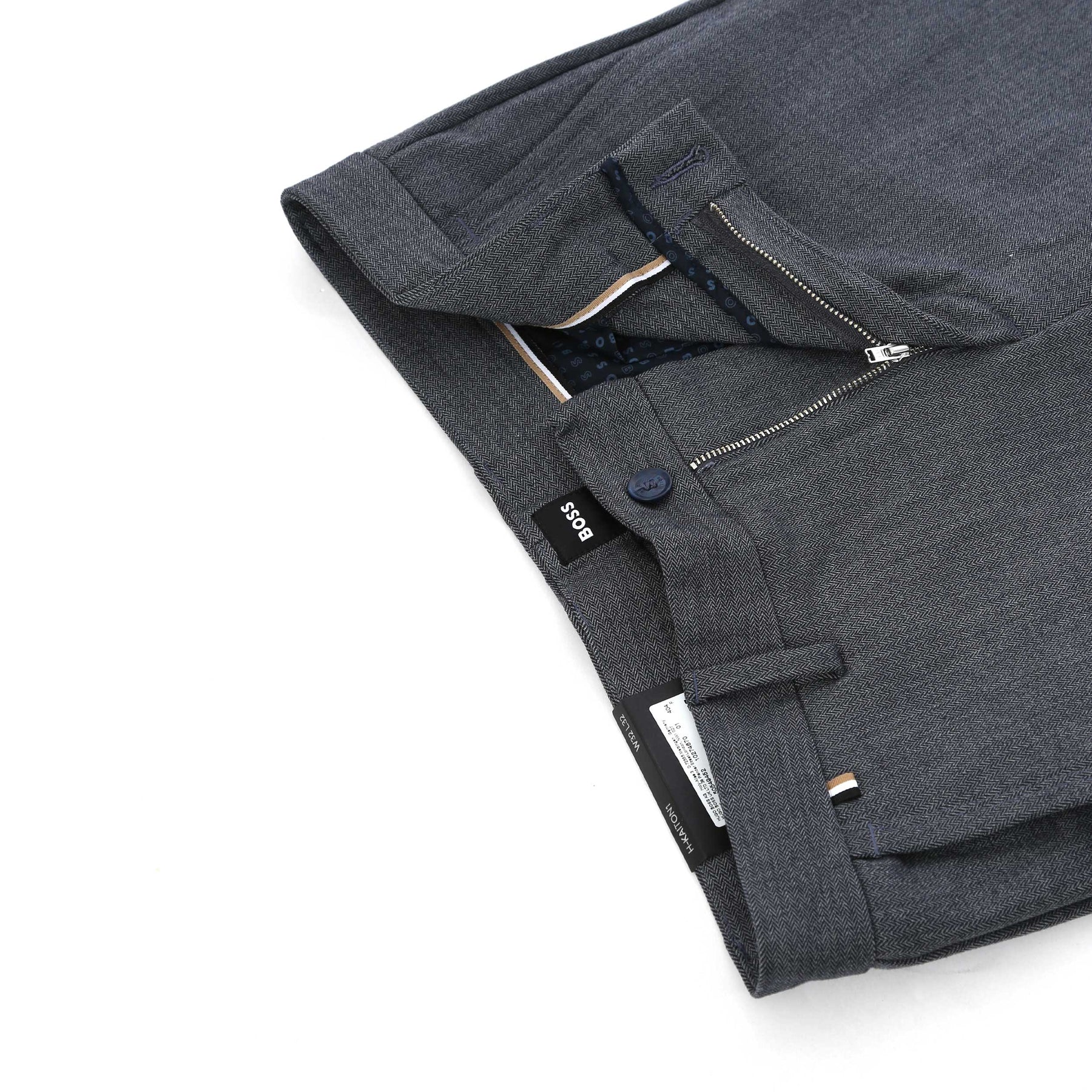 BOSS H Kaiton1 Chino in Dark Blue. Tech fabric chino by BOSS in a slim fit. These lightweight tech chinos features a regular-high waist, button with zip fastening. 2 side slash pockets, 2 piped pockets on the back. Boss logo tab to the seat of the chino. Ideal for chino for both formal and casual occasions.