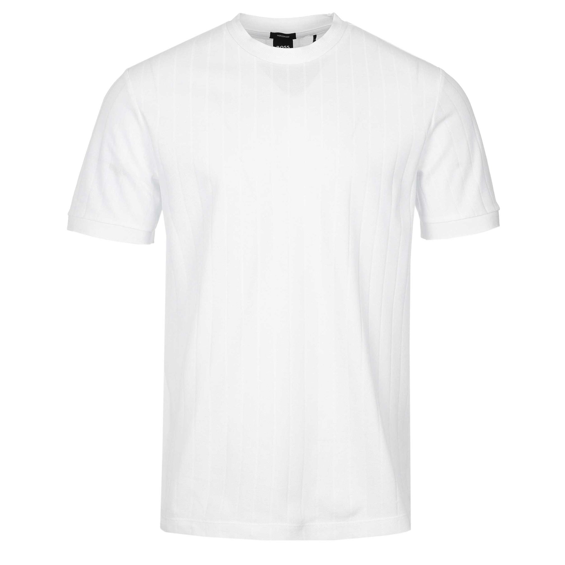 BOSS H Thompson 236 T Shirt in White. The BOSS H Thompson 236 T Shirt T-Shirt is crafted from premium mercerised cotton, delivering exceptional softness, enhanced durability, and a refined finish. Designed in a comfortable regular fit, this luxury BOSS men’s T-shirt features structured vertical stripes that add modern texture and a distinctive edge to a classic everyday style.