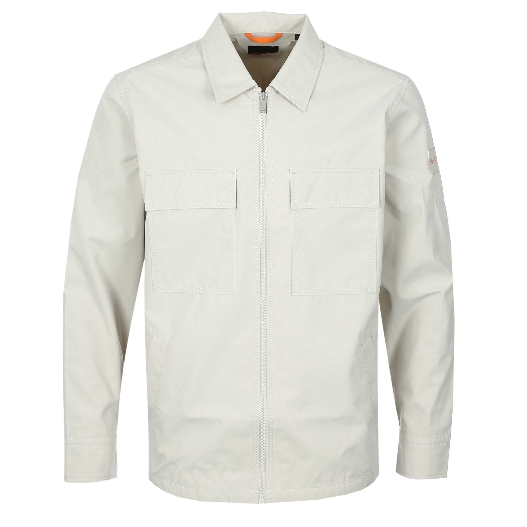BOSS Lozzy M Overshirt in Beige. Overshirt by BOSS with full zip fastening. An oversized fit corduroy overshirt with two slash side entry pockets. Flap pocket to the chest with snap fastening. Classic soft pointed collar. Snap fastening cuff. BOSS logo to the sleeve.