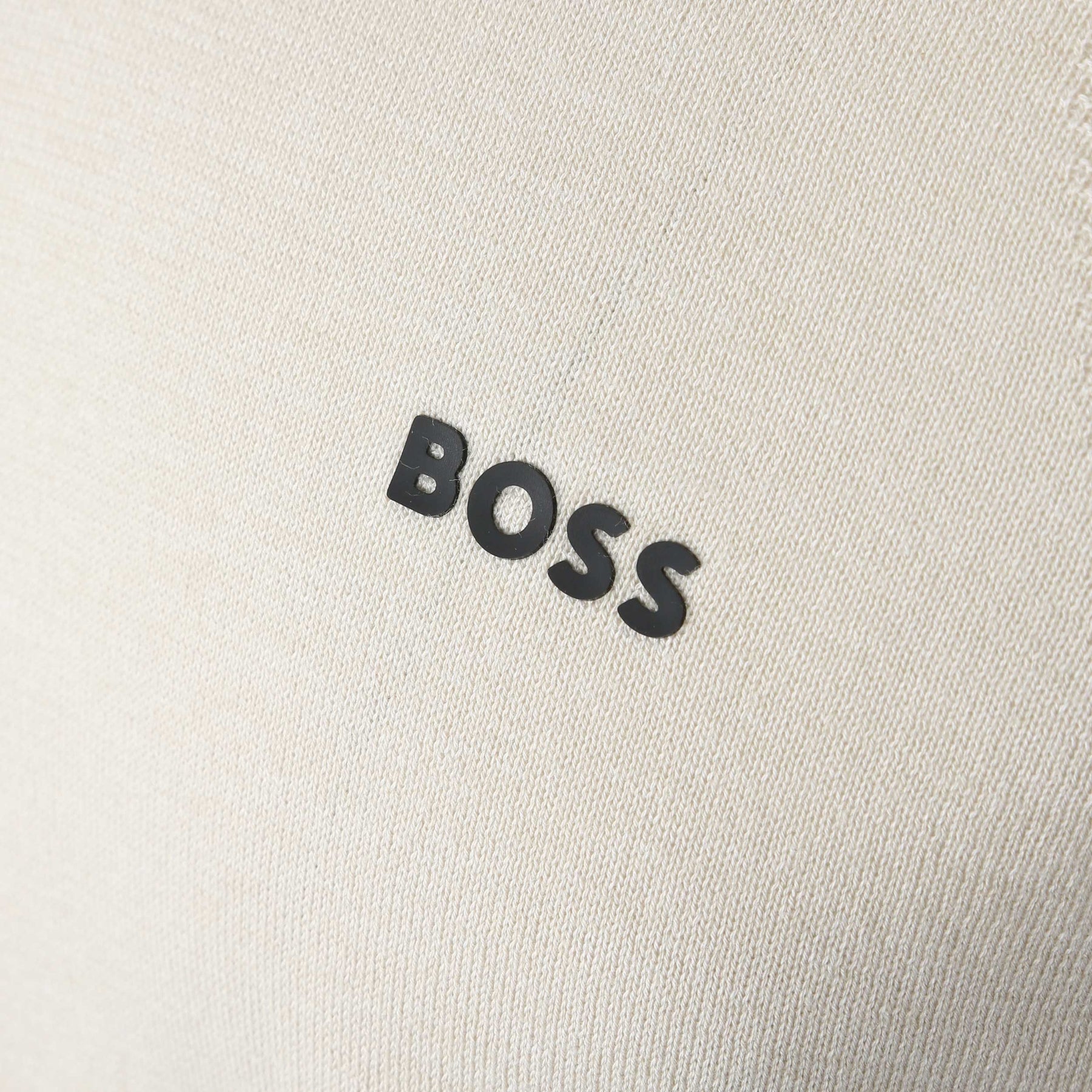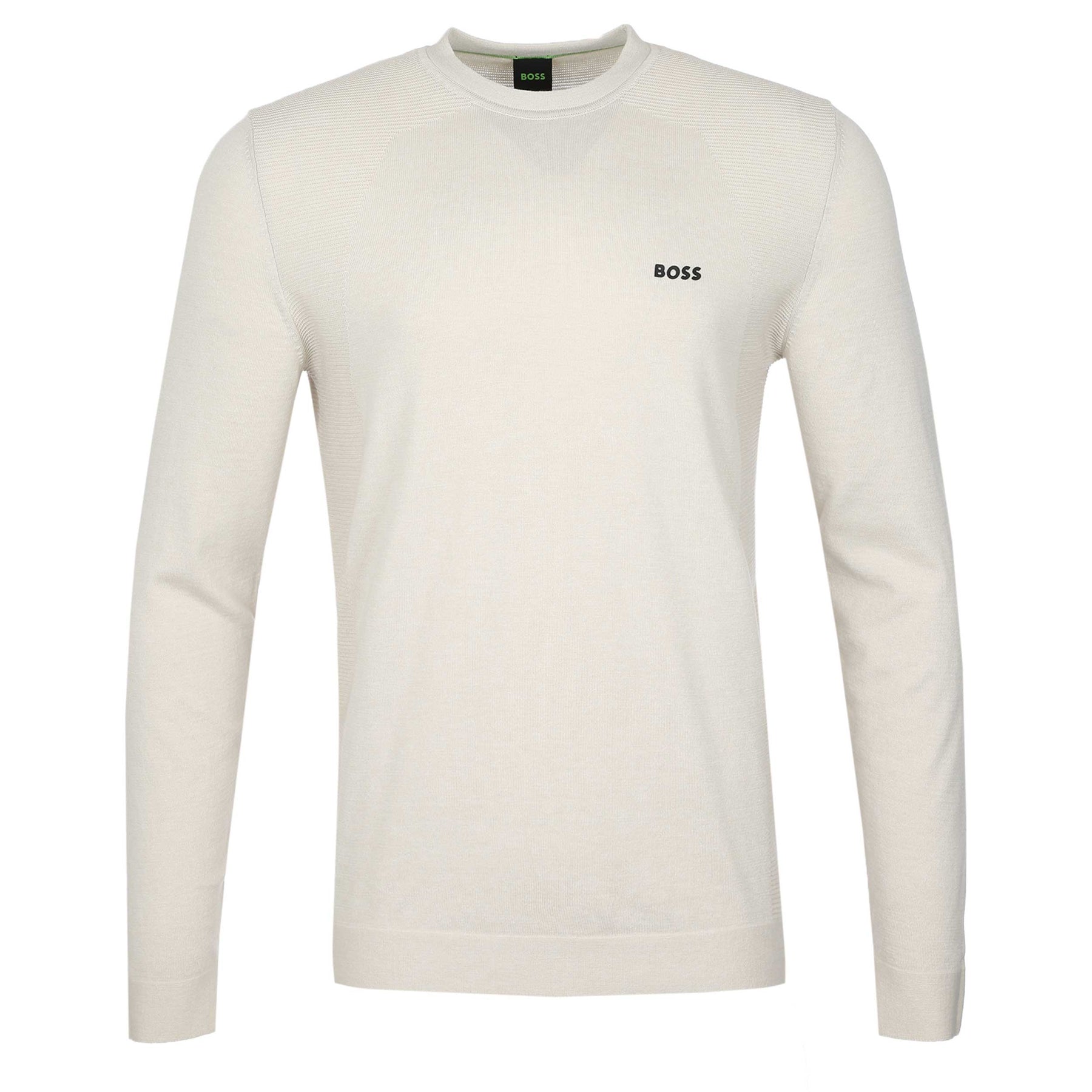 BOSS Momentum_Lite_CN24 in Beige. Crew Neck performance knitwear from BOSS. Ribbed design to the shoulders and side panels. Finished with a rubber BOSS logo on the chest. A knitwear piece perfect to be worn everyday with jeans or to be worn on the golf course.