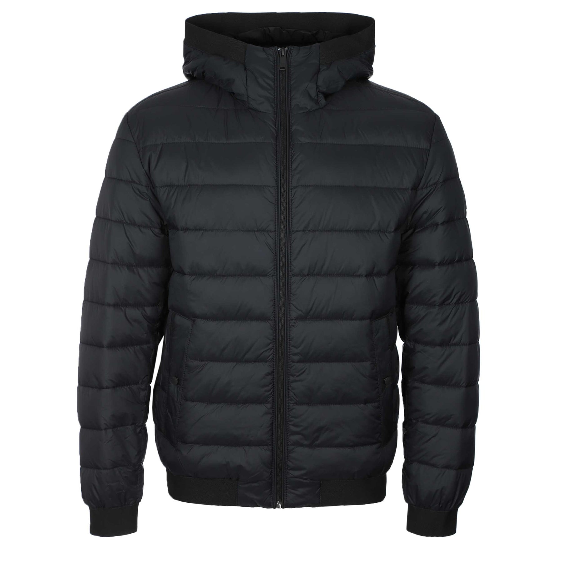 BOSS Odenis Jacket in Black. A padded style coat by BOSS. Arriving in a regular fit with a stand up collar, full zip fastening with a tonal black zip, and 2 front pockets with button fastenings. Elasticated cuffs to keep you warm. Finished with a BOSS logo badge on the sleeve.