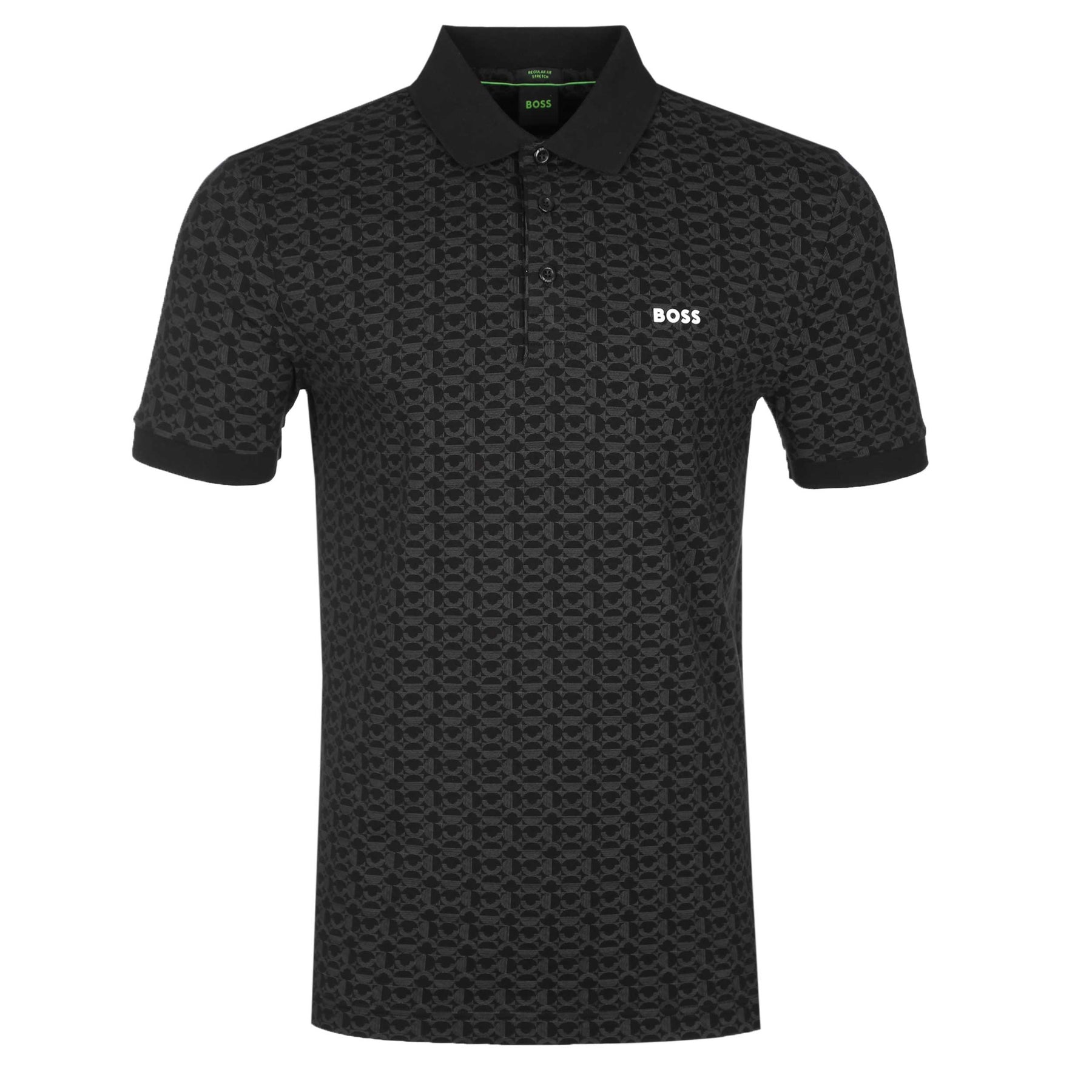 BOSS Paddy Striped C Polo Shirt in Black. A classic Hugo Boss polo shirt in a regular fit. A 3 button fastening placket with a tonal colour printed BOSS logo to the chest. A stretch polo shirt with moisture management properties. Subtle needle stripe design to the polo shirt.