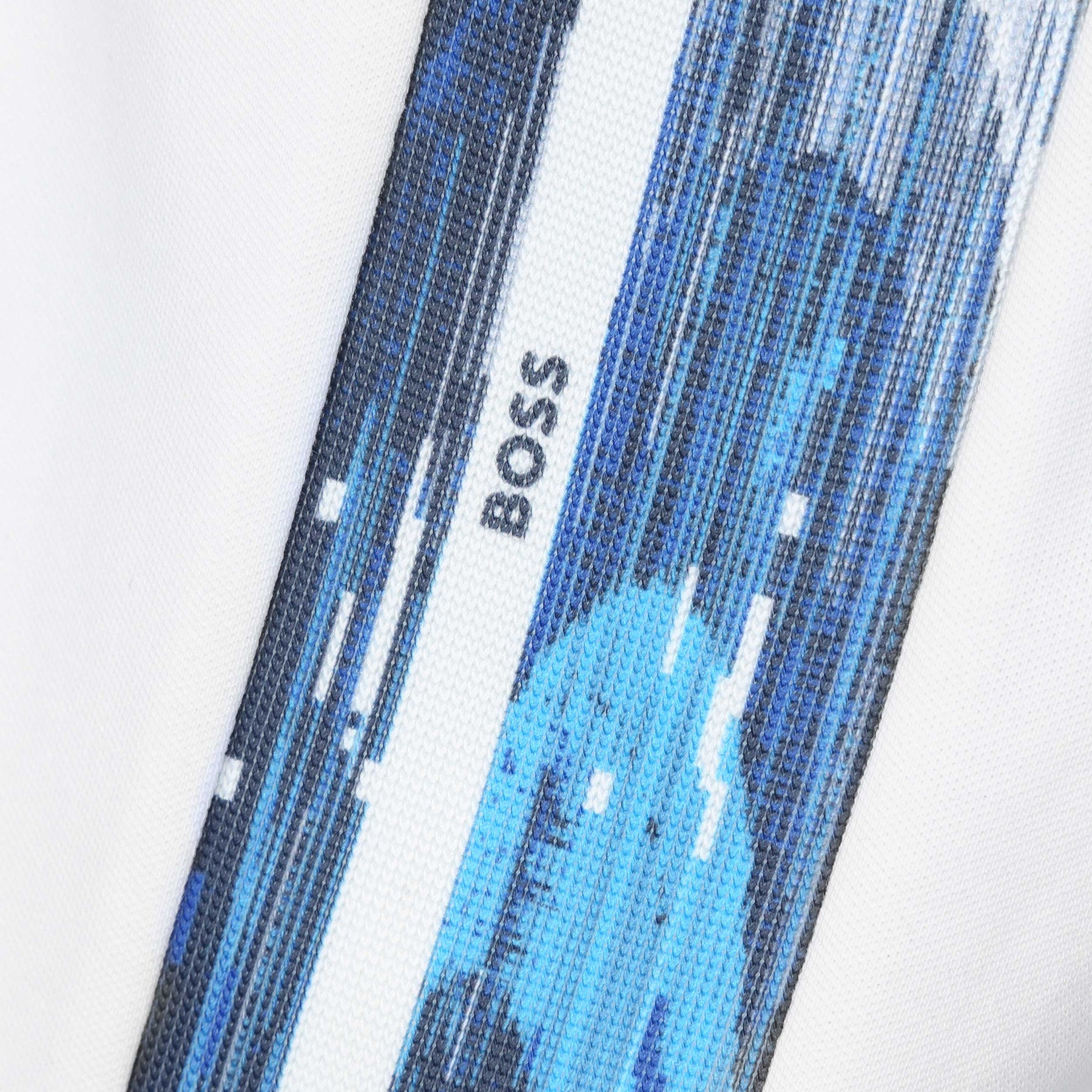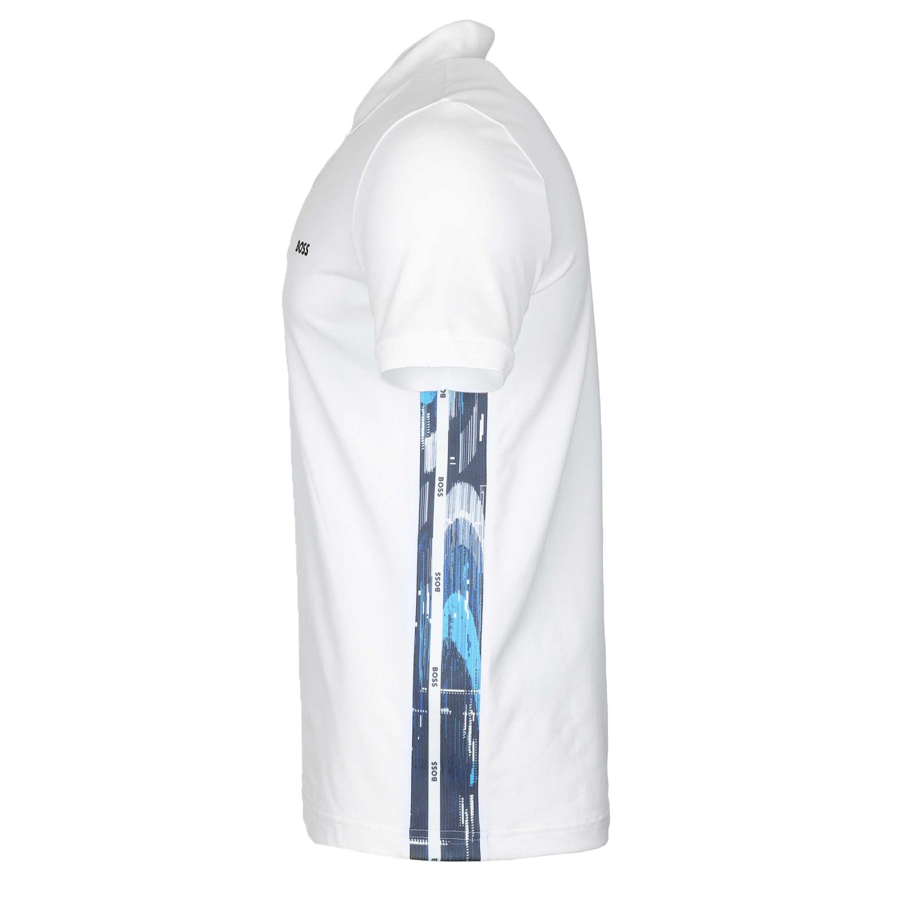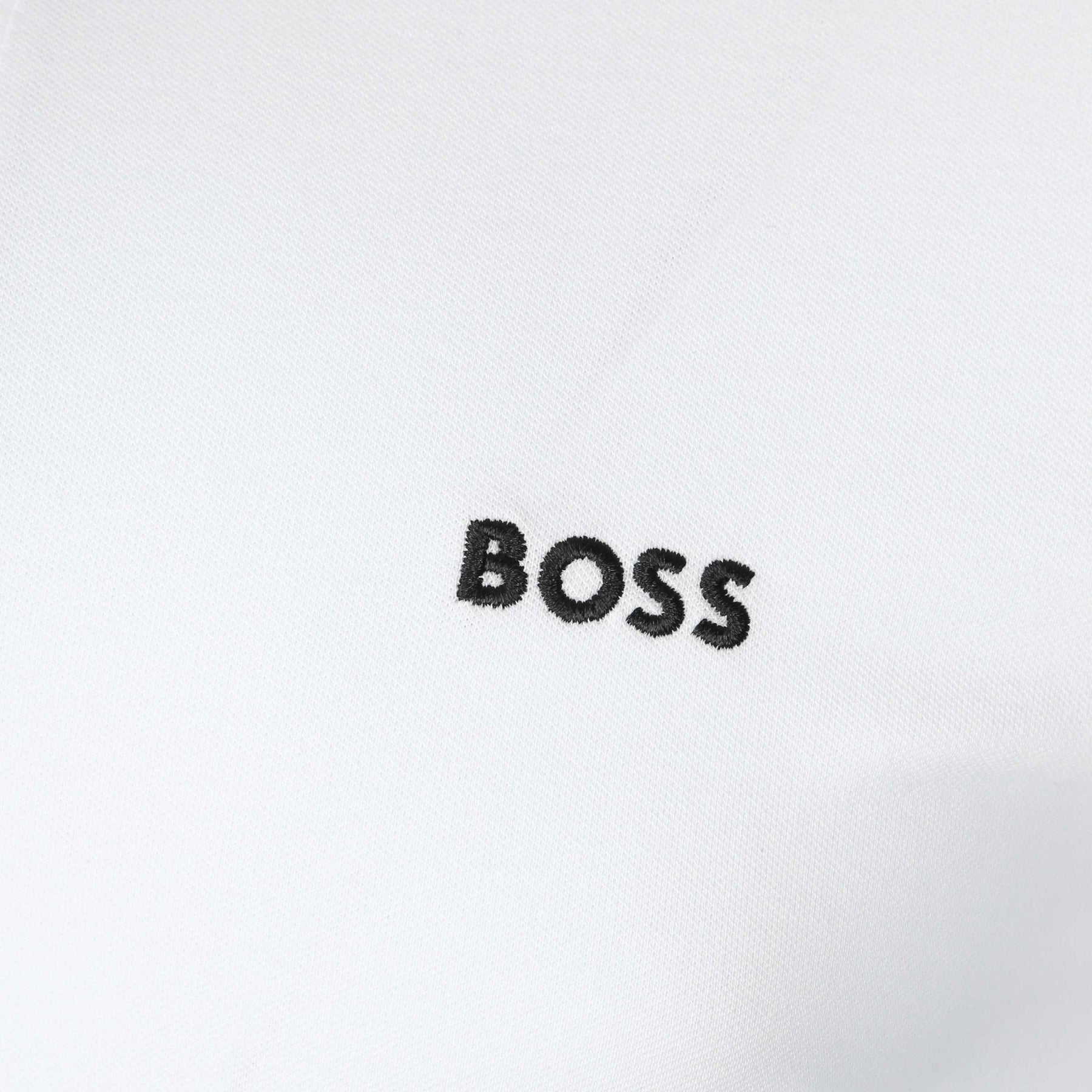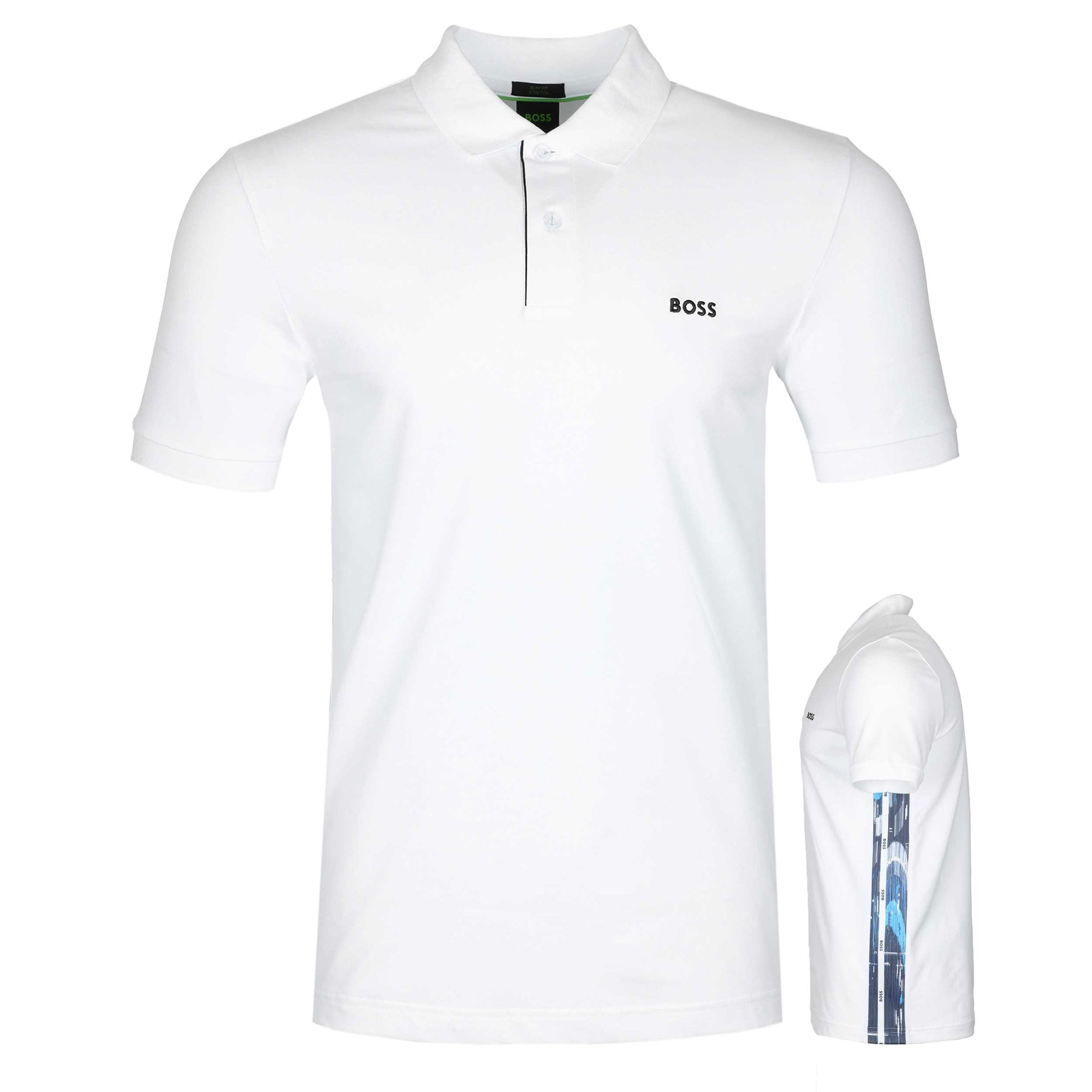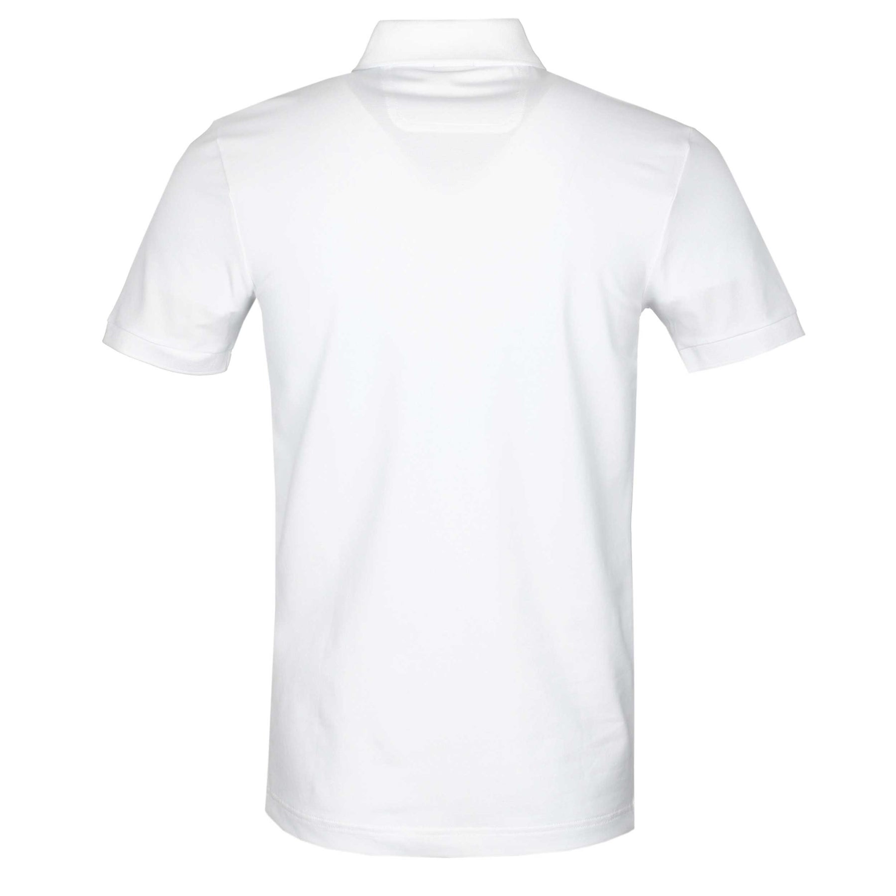 BOSS Paule 2 Polo Shirt in White. A slim fit Hugo Boss polo shirt. It features the classic short sleeves. 2 button fastening placket with contrasting colour collar and cuffs. The placket features patterned tape inserts to the sides. Embroidered Boss logo to the left breast. The perfect casual polo shirt.