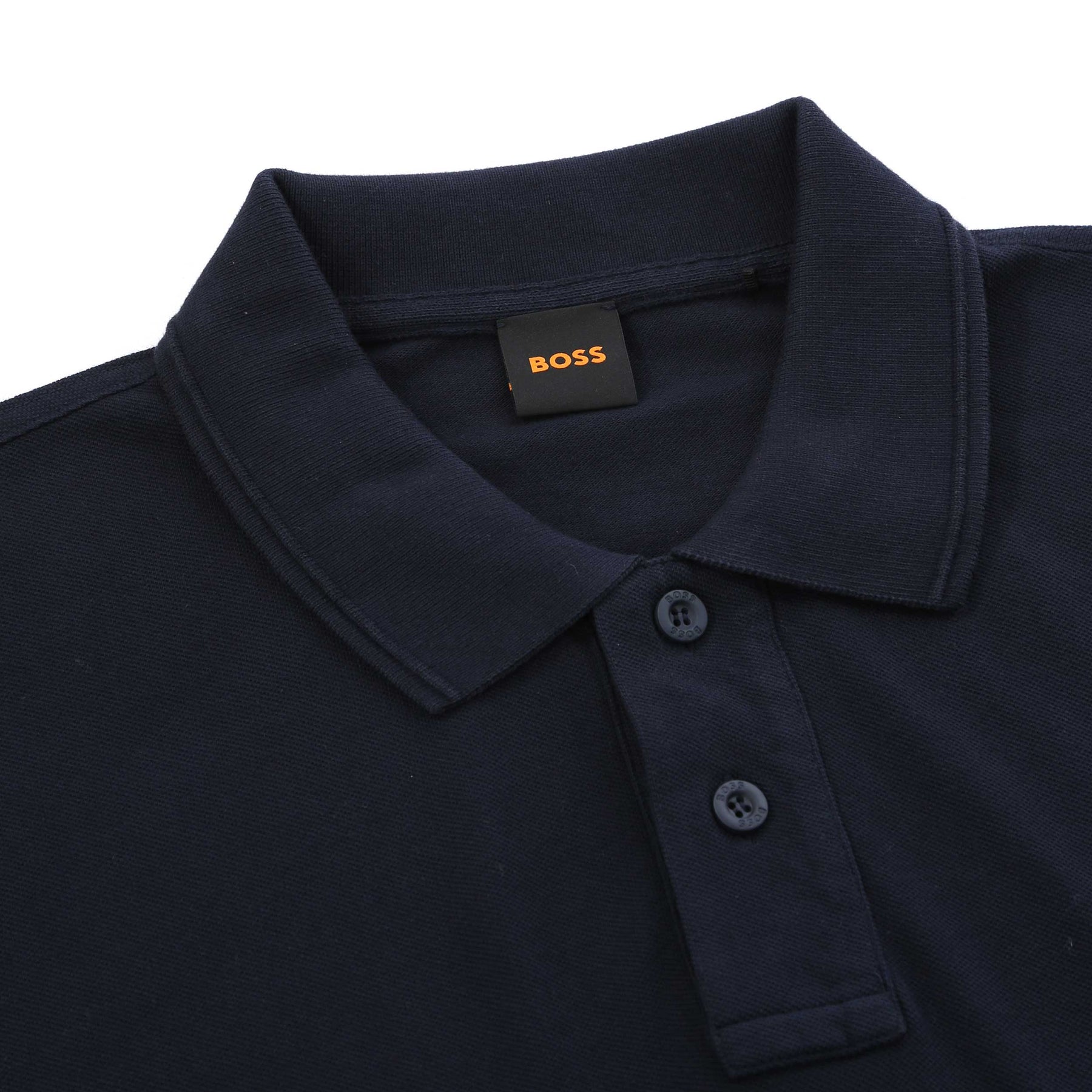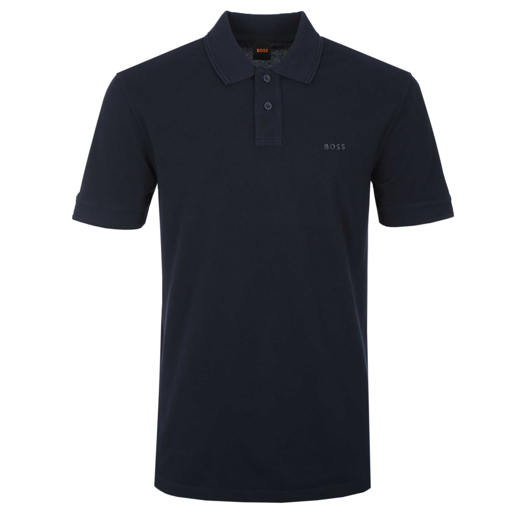 BOSS Prime Polo Shirt in Navy. A classic Hugo Boss polo shirt in a slim fit. A 2 button fastening placket. A BOSS polo shirt with flat knit collar and cuffs. Contrasting colour stripe detailing to the cuffs. Raised rubber logo to the left cuff.