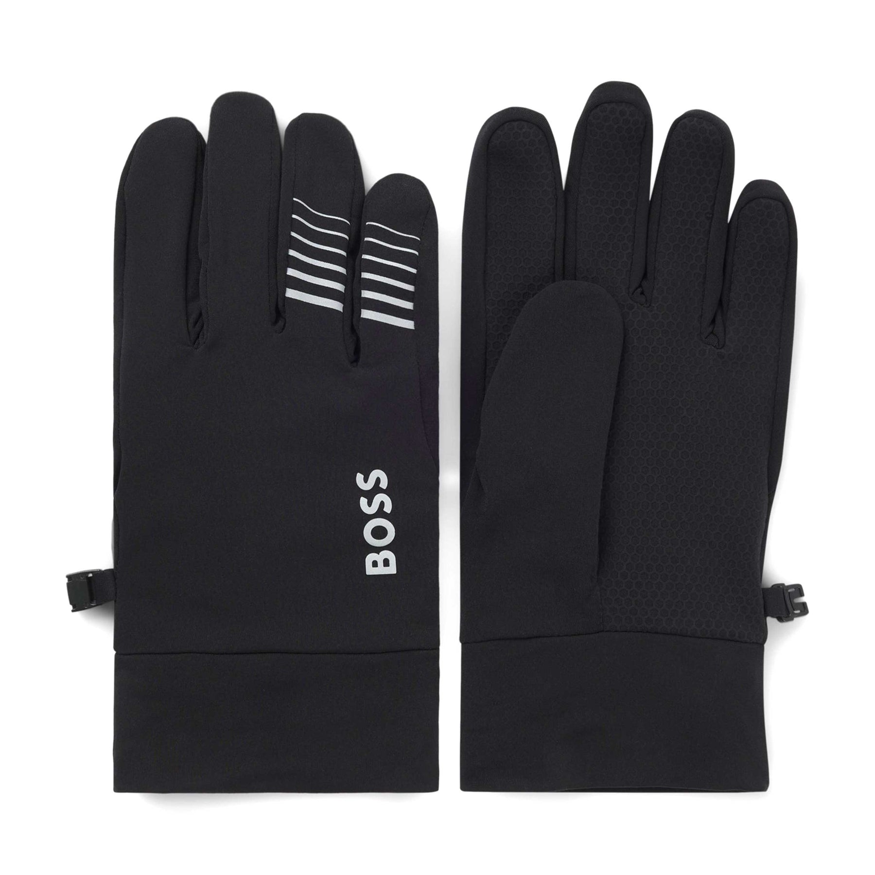 BOSS Running Gloves 4 in Black. A classic pair of gloves by BOSS. This pair feature tech touch pads on the fingers for accessible use of smart phones whilst you are wearing the gloves. Detailed with the BOSS logo in white.