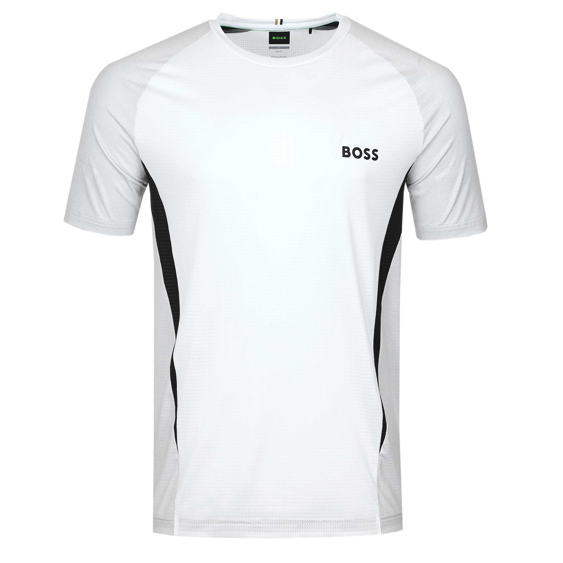BOSS TS TOC Matchball T Shirt in White. This slim-fit BOSS performance top is built for movement, combining an all-over perforated fabric with moisture-management, quick-dry technology and full 4-way stretch. Designed with a clean crew neckline and contrasting grey raglan sleeves, it delivers unrestricted mobility and a modern athletic look. Black panel detailing runs down the sides for a streamlined finish. The signature BOSS logo appears on the chest and at the back of the neckline, completing a technical layer made for training, travel and everyday active wear.