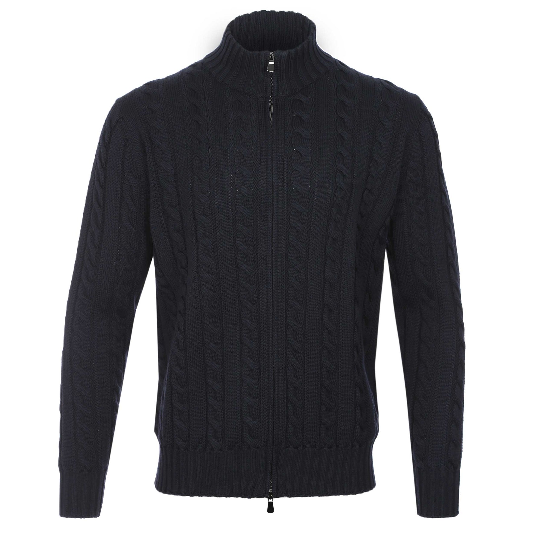 Filippo De Laurentiis Extrafine Merino Cable Knit Zip Knitwear in Navy. This cardigan knitwear is built for comfort and style. Made in Italy this knitwear cable style design knitwear has a full two way zip fastening front. It features a funnel collar and long sleeves. Other features include ribbed collar, cuffs and waistband. Perfect to be worn on it own or layer up under a formal jacket.
