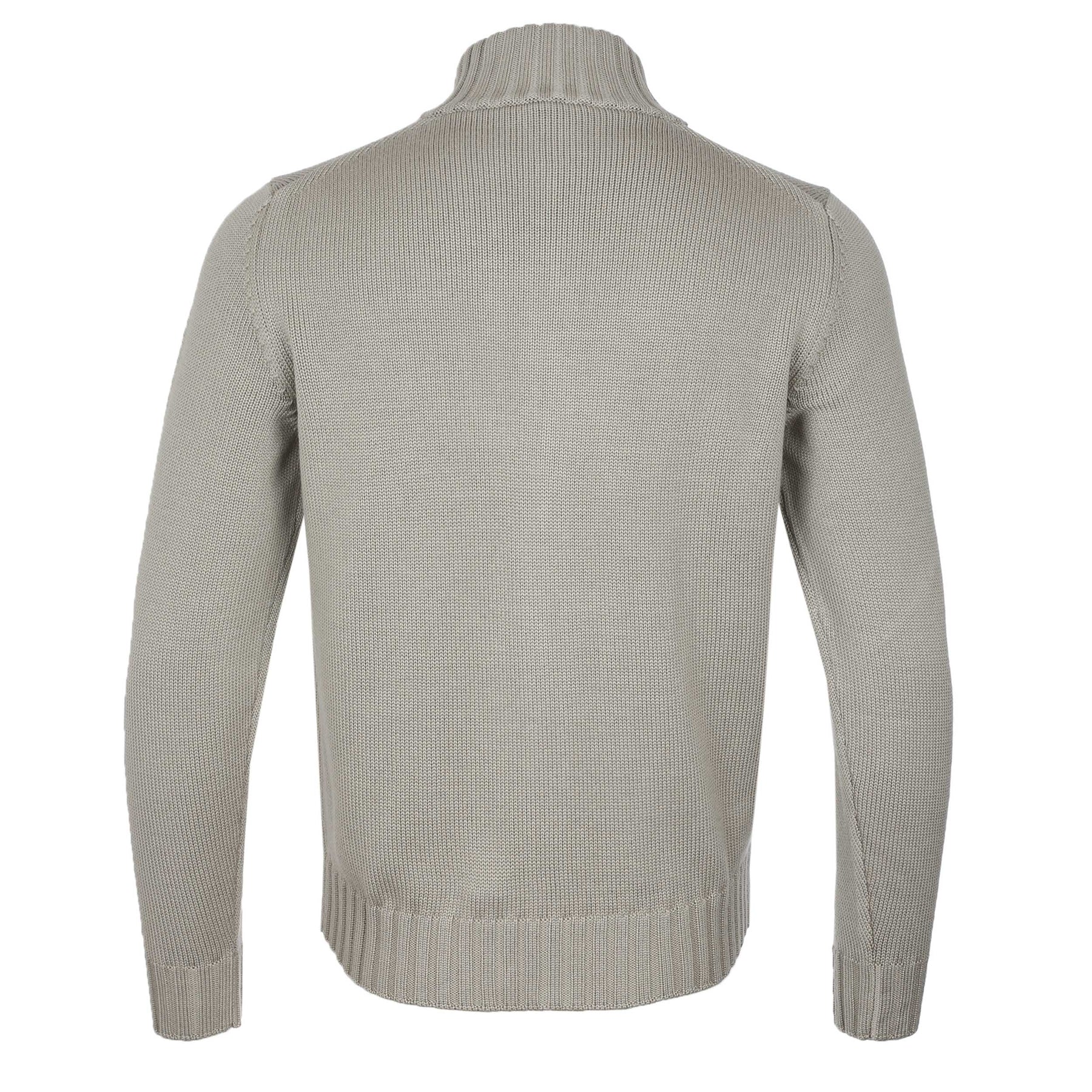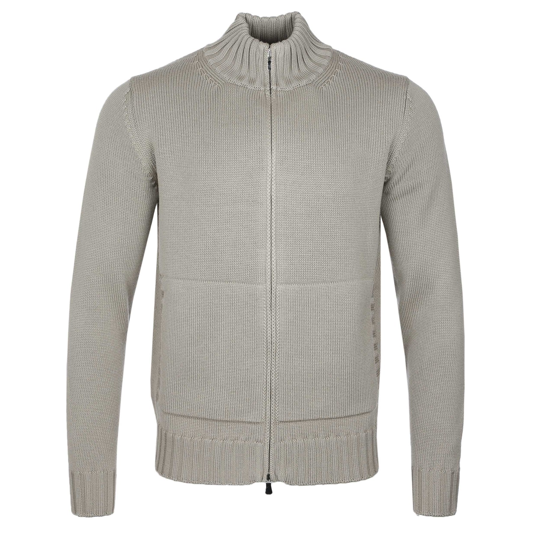 Filippo De Laurentiis Merino Full Zip Cardigan in Taupe. This cardigan knitwear is built for comfort and style. Made in Italy this knitwear has a full two way zip fastening front. It features a funnel collar and long sleeves. Two side entry pockets to the front of the knitwear. Other features include ribbed collar, cuffs and waistband. Perfect to be worn on it own or layer up under a formal jacket.