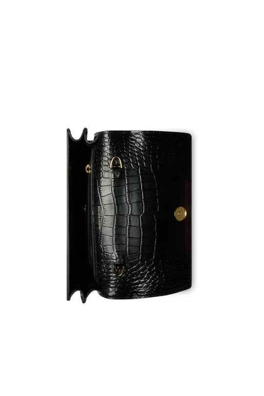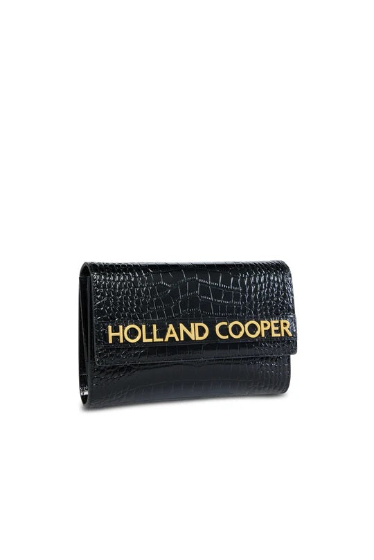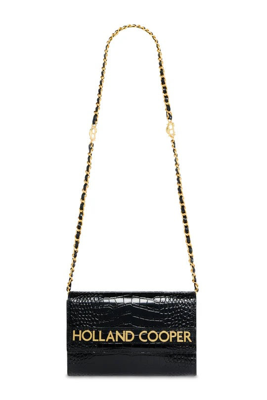 Holland Cooper Abbot Clutch Bag in Black Croc. Clutch bag by Holland Cooper. Detachable leather and gold chain shoulder strap. Bold Holland Cooper branding to the front strap. Fold over front with magnetic fastenings. Gold detailing throughout the clutch bag.