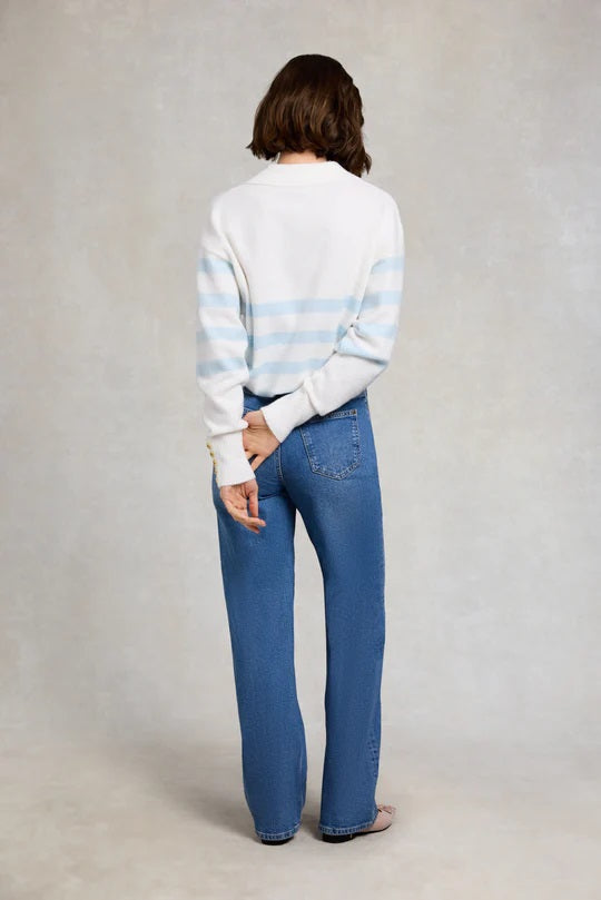 Holland Cooper Lydia Quarter Zip Knit in Natural Powder Blue. The Lydia Quarter Zip is designed in a relaxed, boxy silhouette for an easy, contemporary feel. A fold-over collar adds a subtle statement, while the jetted quarter zip – finished with a signature HC branded pull – delivers both style and practicality. Ribbed cuffs and hem provide a clean, structured finish, while five iconic HC rivets at the cuffs pay homage to Holland Cooper’s heritage detailing.