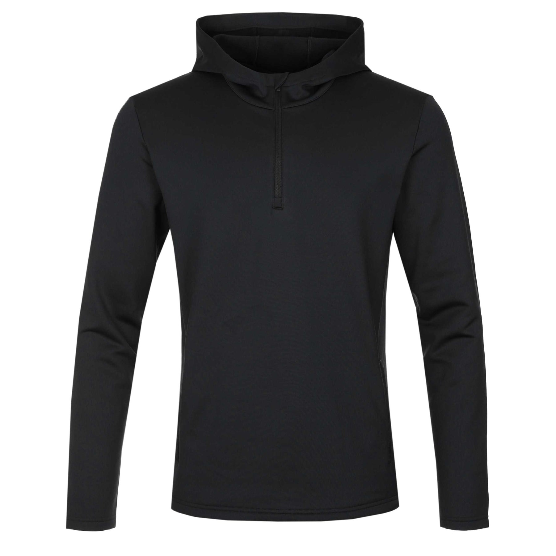 J.Lindeberg Aerial Quarter Zip Hood in Black. Designed for active comfort and versatile wear, the Aerial Quarter Zip Hood delivers a lightweight feel with a clean, modern edge. Engineered in technical stretch fabric, it offers flexibility, breathability and ease of movement, making it ideal for performance use on the course or everyday wear off it. A streamlined hood and quarter-zip neckline provide adjustable coverage and effortless layering, while the minimalist design ensures a sharp look across sport and lifestyle settings.