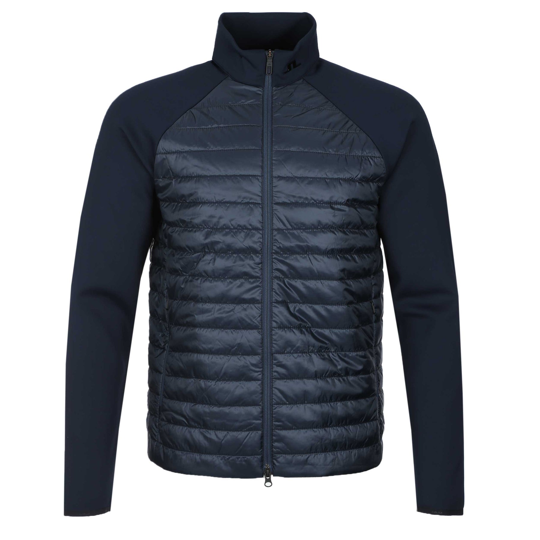 J.Lindeberg Hayden Quilt Hybrid Jacket in JL Navy. Hybrid quilted jacket by J.Lindeberg. This lightweight quilted panels provides added warmth with contrasting stretch-knit sleeves. Water repellent properties to the jacket. Two zip pockets to the front of the jacket. JL bridge logo to the front and rear of the collar.