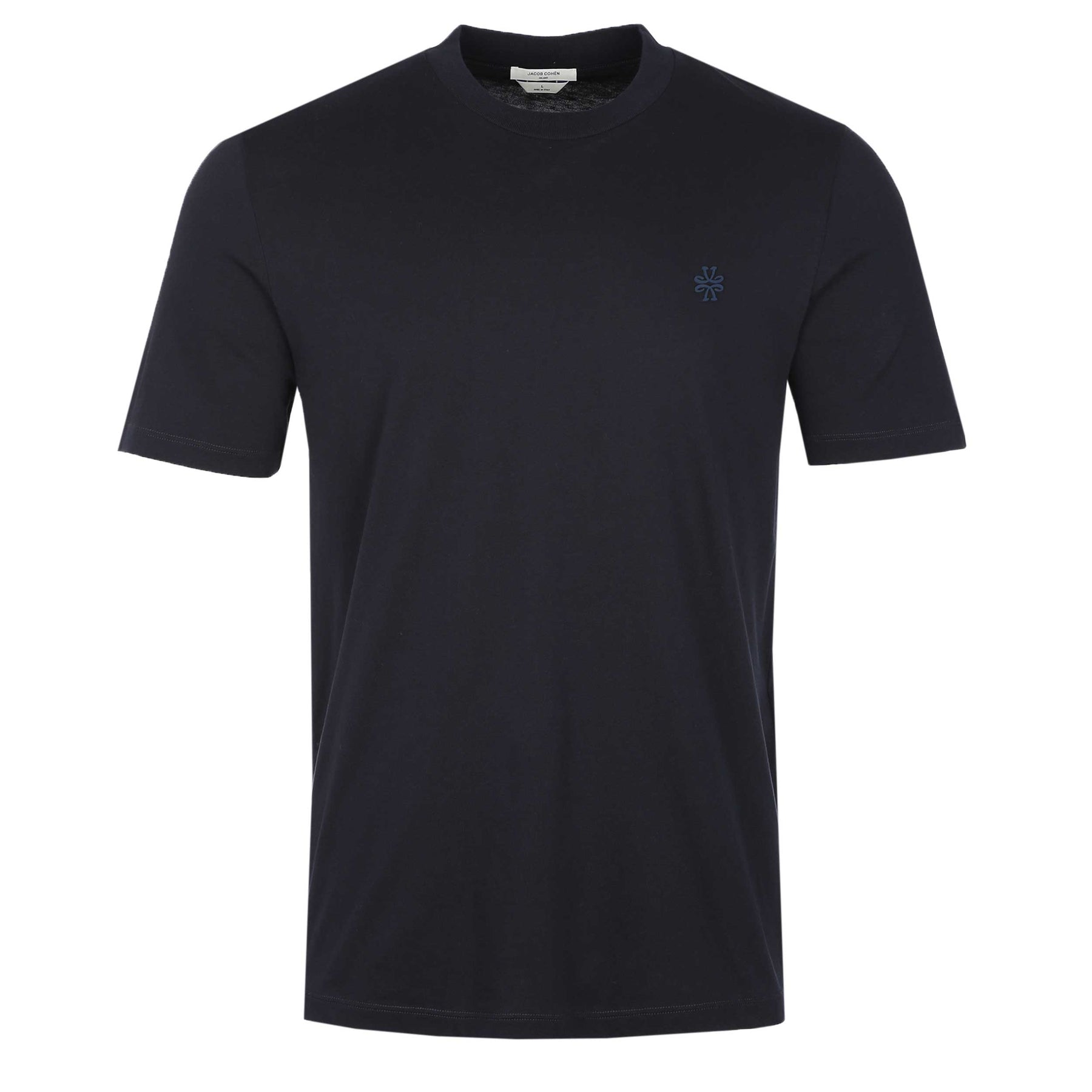 Jacob Cohen Basic JC T Shirt in Navy. A classic crew neck design with short sleeves. A plain design t shirt with a tonal rubberised Jacob Cohen logo badge to the chest. This versatile, easy to wear to wear t shirt is perfect to team up with your Jacob Cohen jeans.
