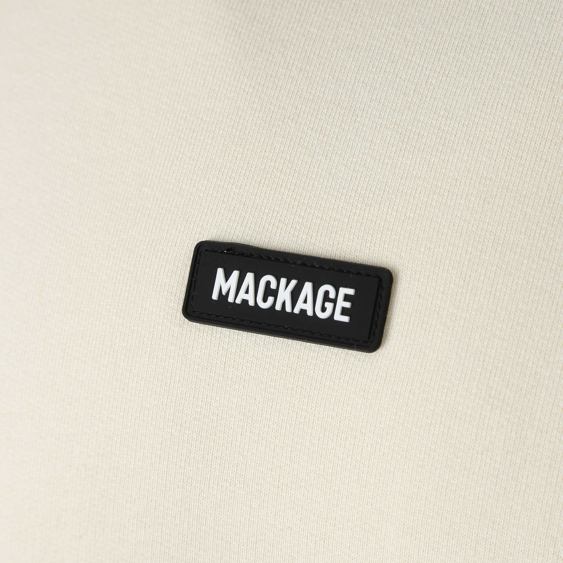 Mackage Justice Crew Neck Sweat Top in Cream. An oversized fit sweat top by Mackage. This Mackage sweat top features a silicon Mackage logo badge to the chest. Drop shoulders style. Ribbed collar, cuffs and waistband. Matching sweatpant available.