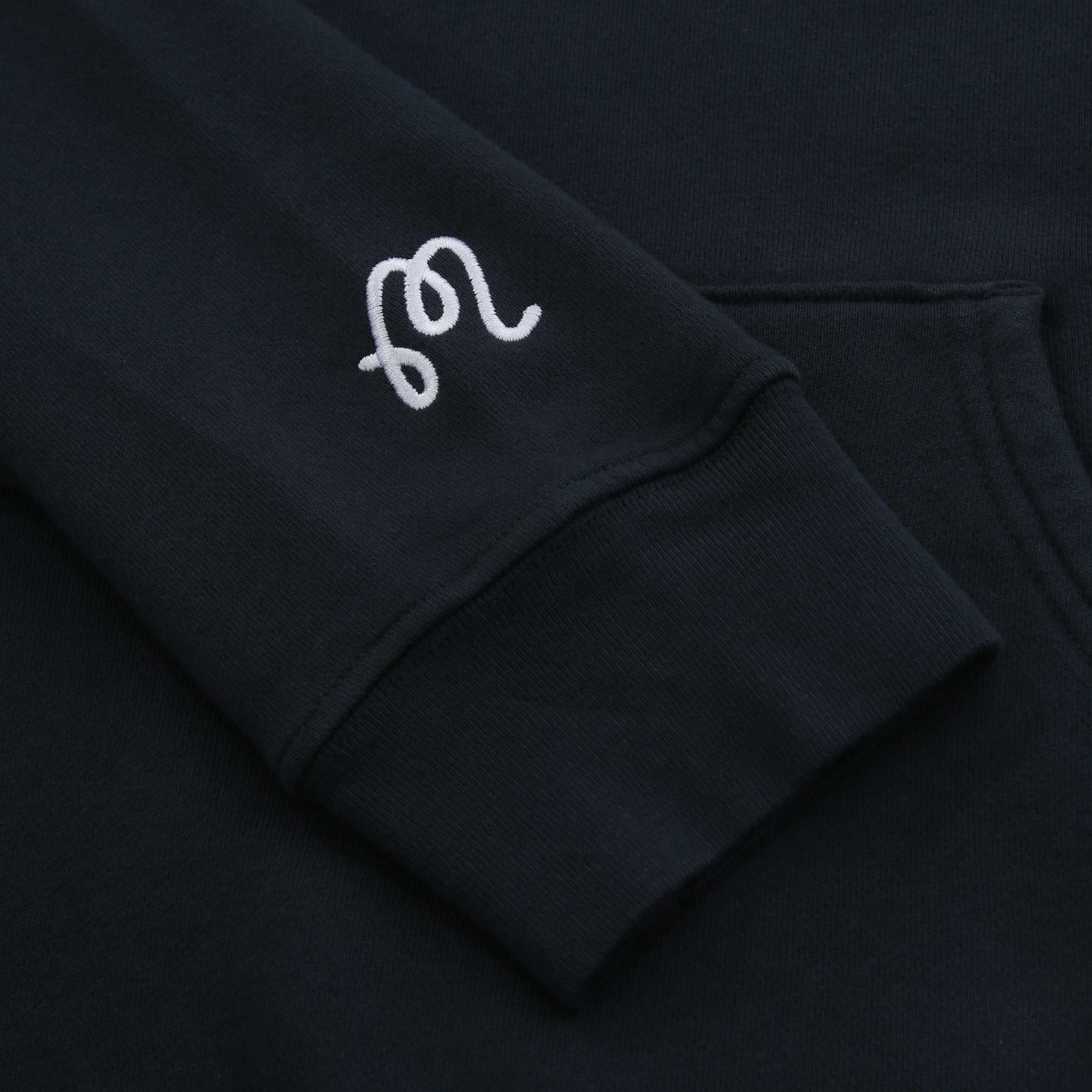 Malbon Fesque Hoodie Sweatshirt in Navy. Hoodie sweatshirt by Malbon. This over the head sweatshirt has a contrasting Malbon script logo embroidered to the chest and right cuff. Kangaroo pocket to the front. Ribbed cuff and waistband.