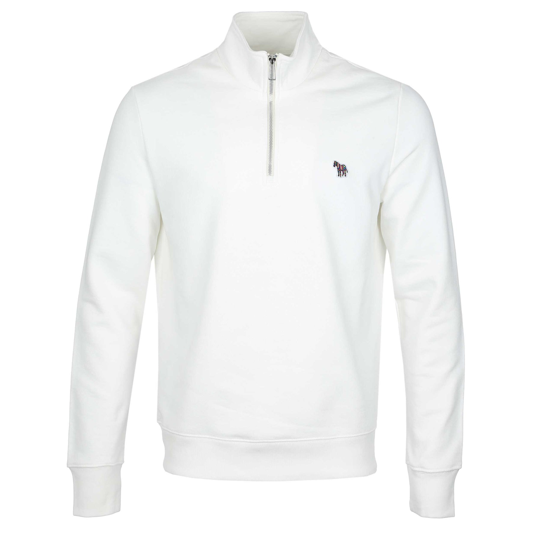 Paul Smith Half Zip Sweat Top in Off White. A sweat top by Paul Smith. Featuring long sleeves, a funnel neck and half zip fastening. Zebra logo badge to the chest. Finished with a ribbed waistband and cuffs. Perfect for everyday wear.