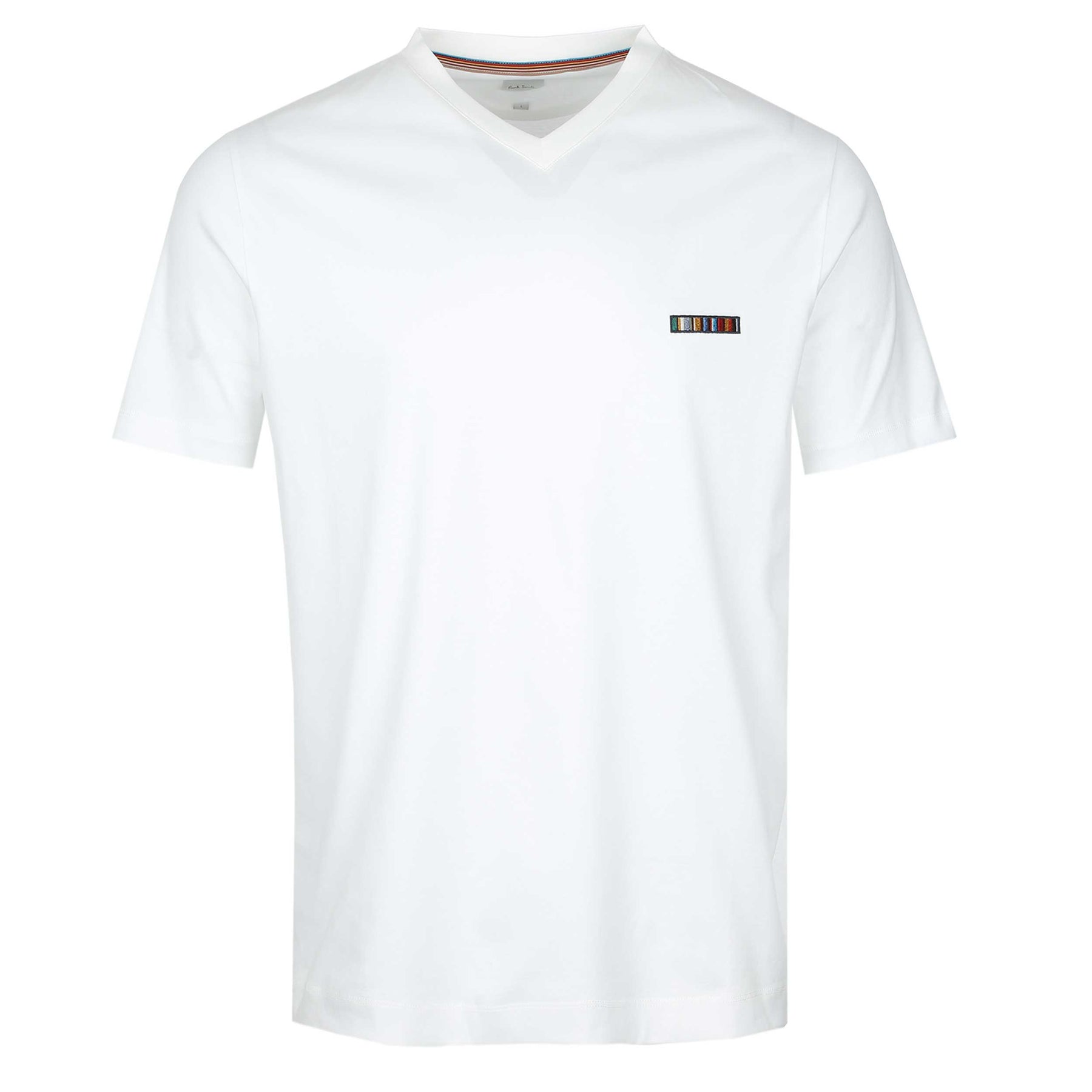 Paul Smith Stripe Emb T Shirt in White. A classic T shirt by Paul Smith with a v neck and short sleeves. A contrasting signature multi-coloured stripe logo badge to the chest of the t-shirt. Paul Smith t-shirt that is perfect to wear on its own or layer underneath a jacket/knitwear.