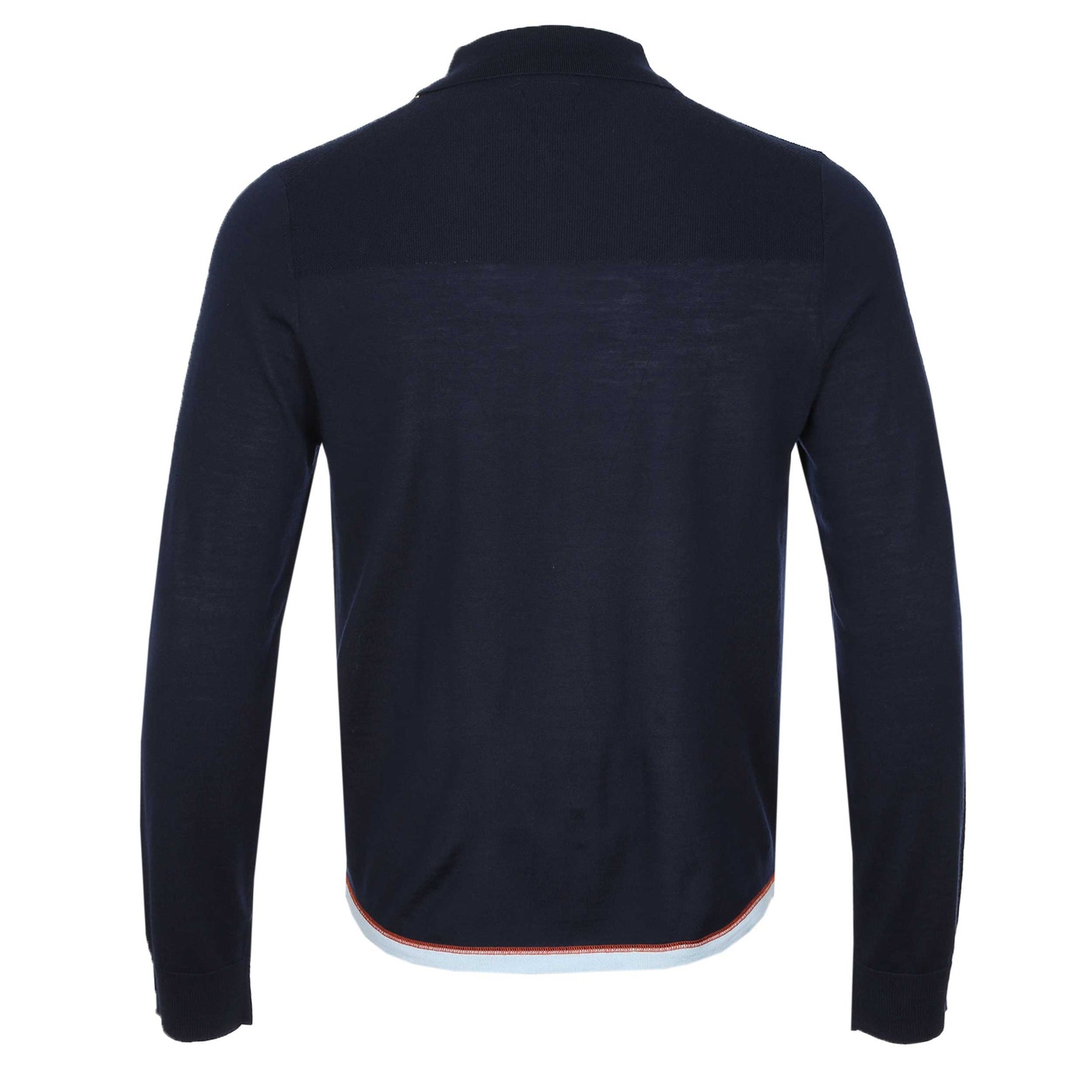 Paul Smith Zip Thru Merino Cardigan in Navy. This 100% wool cardigan knitwear is built for comfort and style. Full zip fastening cardigan. Polo style collar. Contrasting colour trim to the waistband. Textured shoulder panel design. Other features include ribbed cuffs and collar.