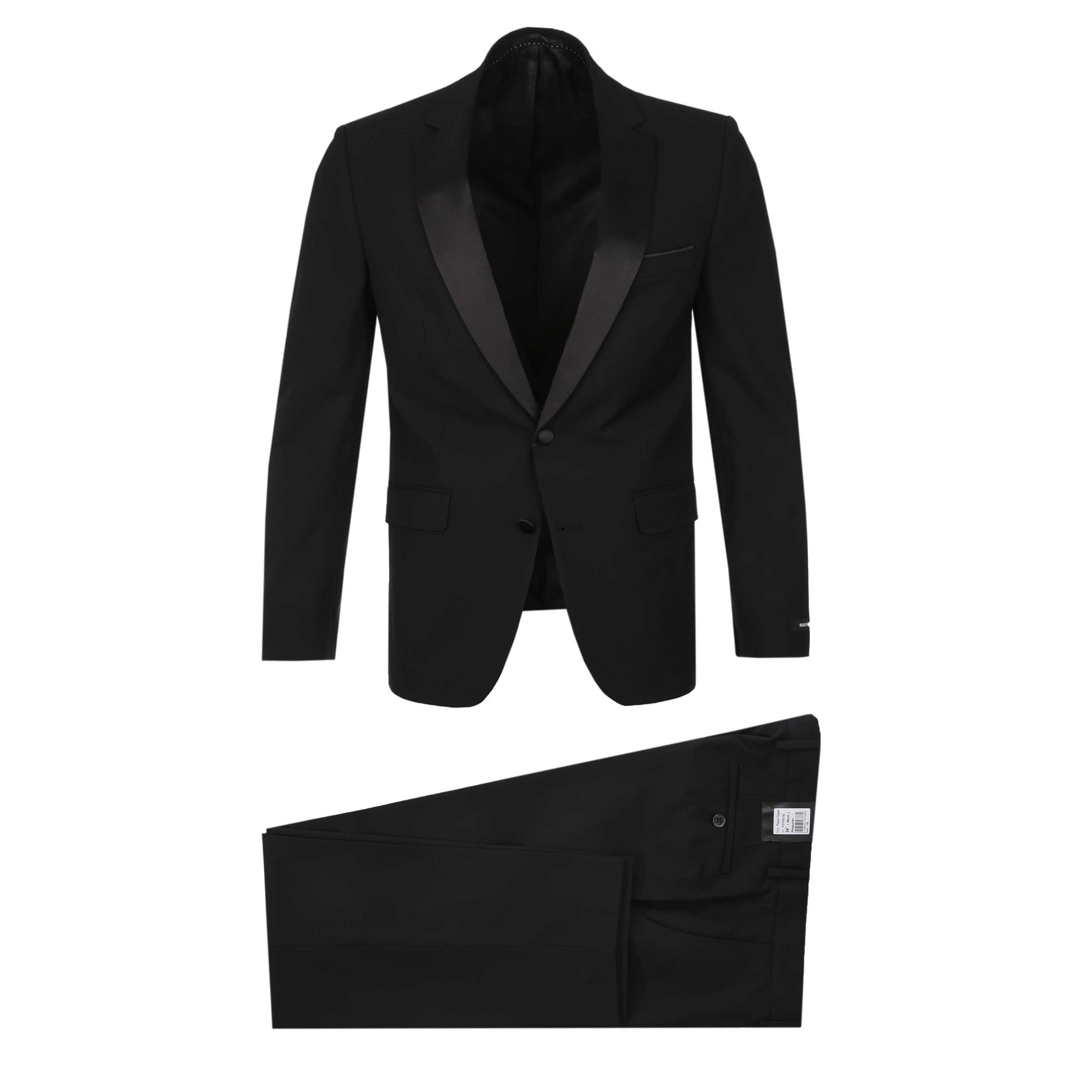 Complementing the jacket, the slim-fit trousers are equipped with a striking satin side stripe and expertly pressed creases that contribute to a sharp, polished look. These trousers not only elevate the ensemble but also ensure a comfortable fit that allows for easy movement.
