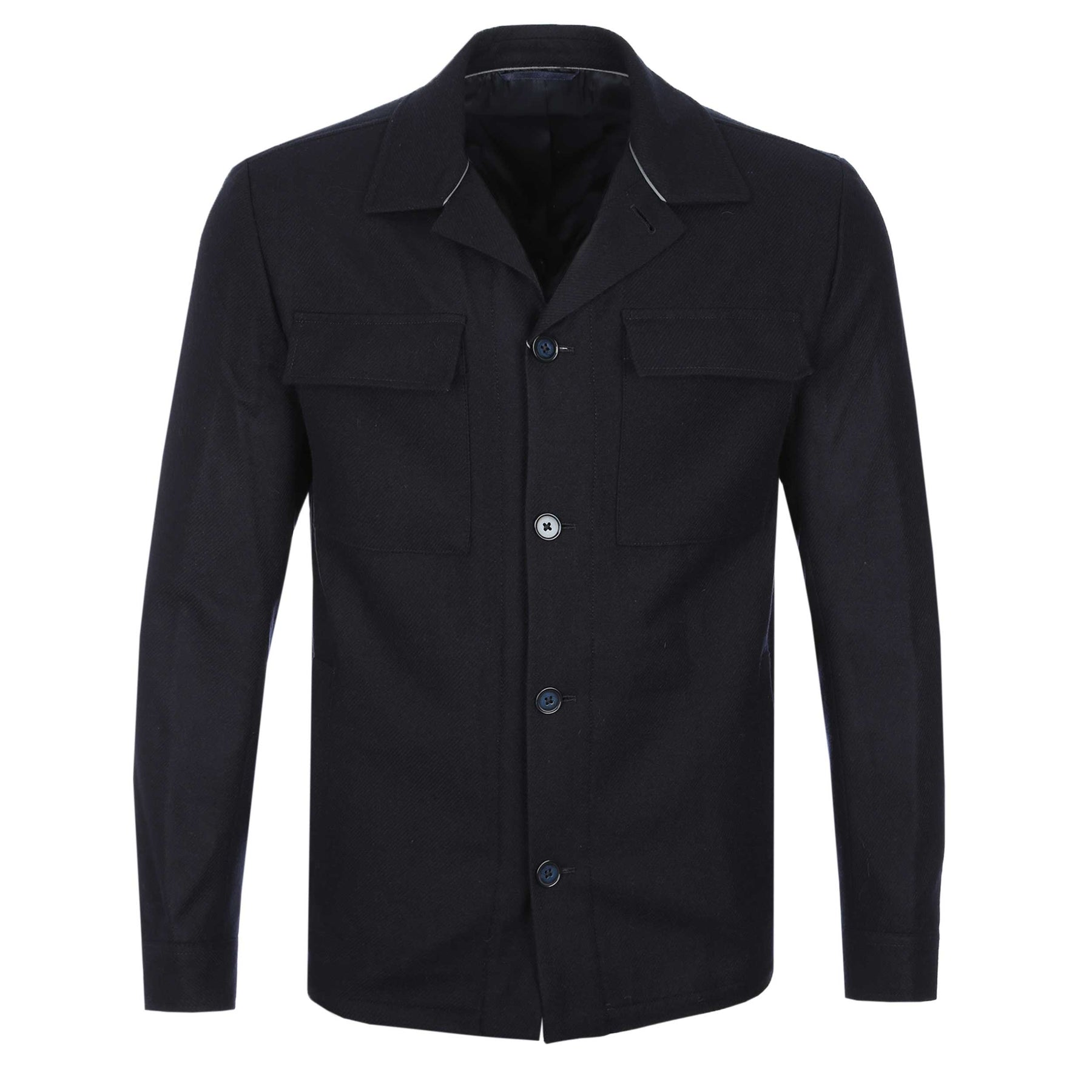 Thomas Maine Monza Overshirt in Navy. A Thomas Maine overshirt cut to a regular fit. Full button fastening placket with a classic collar. Crafted from a wool mix. Finished with two flap chest pockets and two side entry pockets top the front. Embroidered logo to the cuff. Button fastening to the cuffs. Perfect overshirt to layer up with a t-shirt